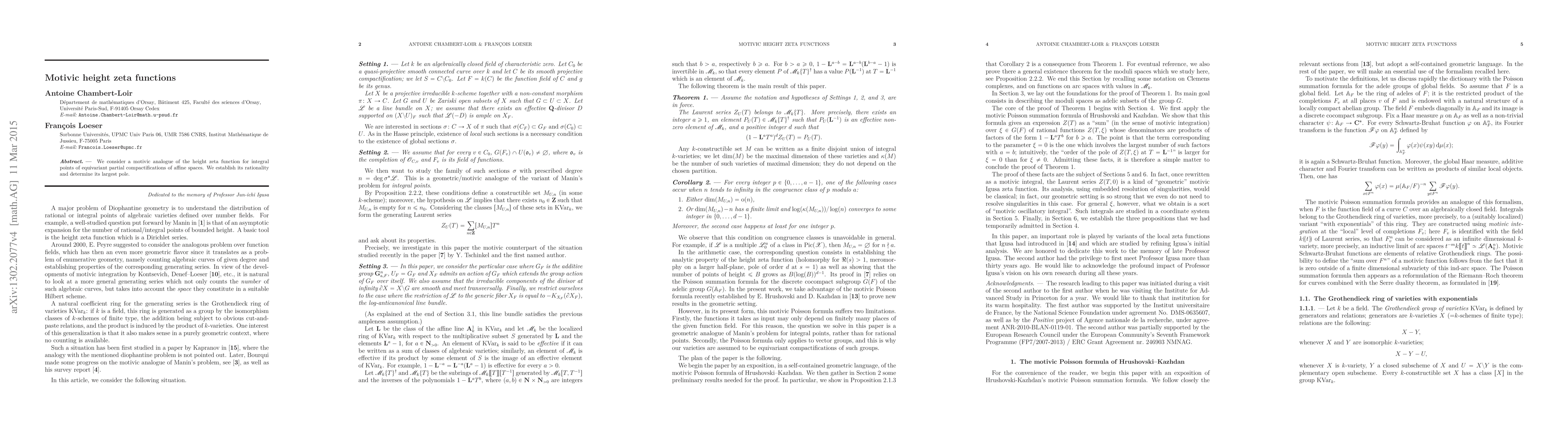 Let $C$ be a projective smooth connected curve over an algebraically closed field of characteristic zero, let $F$ be its field of functions, let $C_0$ be a dense open subset of $C$. Let $X$ be a projective flat morphism to $C$ whose generic fiber $X_F$ is a smooth equivariant compactification of $G$ such that $D=X_F\setminus G_F$ is a divisor with strict normal crossings, let $U$ be a surjective and flat model of $G$ over $C_0$. We consider a motivic height zeta function, a formal power series with coefficients in a suitable Grothendieck ring of varieties, which takes into account the spaces of sections $s$ of $X\to C$ of given degree with respect to (a model of) the log-anticanonical divisor $-K_{X_F}(D)$ such that $s(C_0)$ is contained in $U$. We prove that this power series is rational, that its "largest pole" is at $\mathbf L^{-1}$, the inverse of the class of the affine line in the Grothendieck ring, and compute the "order" of this pole as a sum of dimensions of various Clemens complexes at places of $ C\setminus C_0$. This is a geometric analogue of a result over number fields by the first author and Yuri Tschinkel (Duke Math. J., 2012). The proof relies on the Poisson summation formula in motivic integration, established by Ehud Hrushovski and David Kazhdan (Moscow Math. J, 2009).