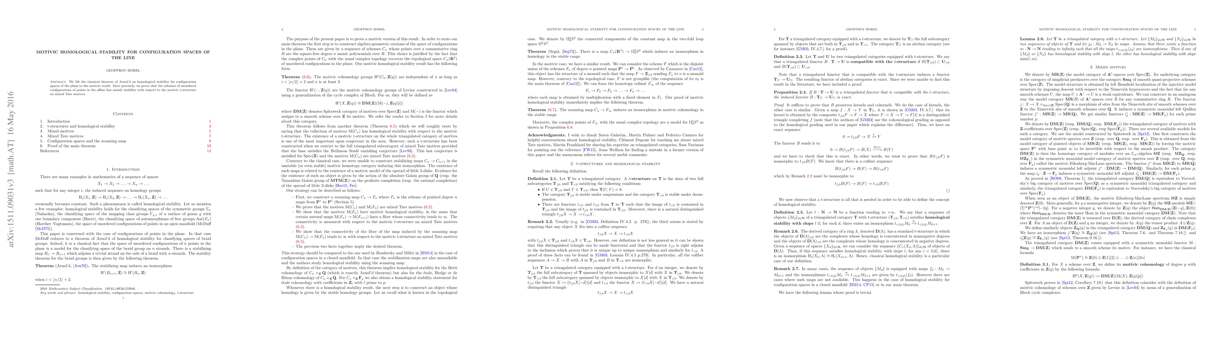 The paper establishes motivic homological stability for configurations spaces of points along the affine line, extending Arnol'd's classical result for planar configurations to the motivic realm, utilizing the motivic t-structure on mixed Tate motives.
