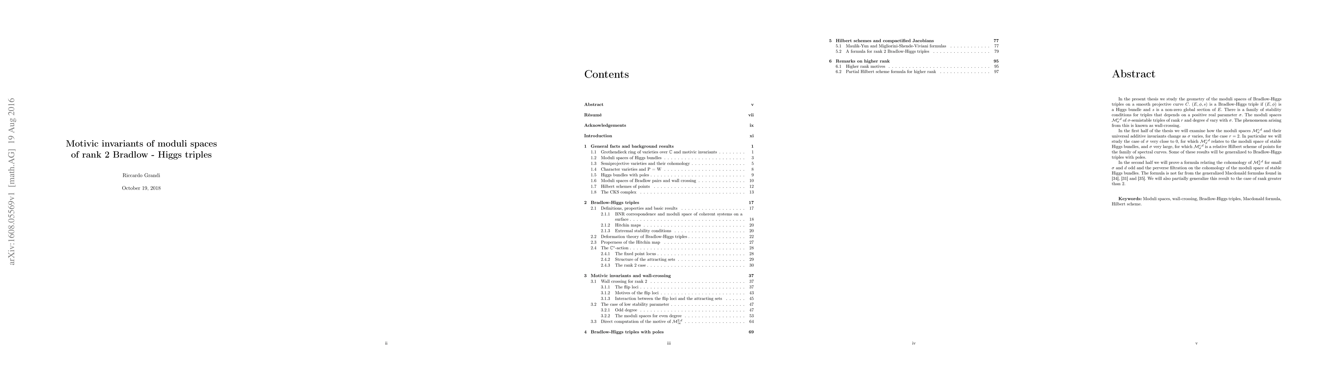 In the present thesis we study the geometry of the moduli spaces of Bradlow-Higgs triples on a smooth projective curve $C$. $(E,\varphi, s)$ is a Bradlow-Higgs triple if $(E,\varphi)$ is a Higgs bundle and $s$ is a non-zero global section of $E$. There is a family of stability conditions for triples that depends on a positive real parameter $\sigma$. The moduli spaces $\mathcal{M}_\sigma^{r,d}$ of $\sigma$-semistable triples of rank $r$ and degree $d$ vary with $\sigma$. The phenomenon arising from this is known as wall-crossing. In the first half of the thesis we will examine how the moduli spaces $\mathcal{M}_\sigma^{r,d}$ and their universal additive invariants change as $\sigma$ varies, for the case $r=2$. In particular we will study the case of $\sigma$ very close to 0, for which $\mathcal{M}_\sigma^{r,d}$ relates to the moduli space of stable Higgs bundles, and $\sigma$ very large, for which $\mathcal{M}_\sigma^{r,d}$ is a relative Hilbert scheme of points for the family of spectral curves. Some of these results will be generalized to Bradlow-Higgs triples with poles. In the second half we will prove a formula relating the cohomology of $\mathcal{M}_\sigma^{2,d}$ for small $\sigma$ and $d$ odd and the perverse filtration on the cohomology of the moduli space of stable Higgs bundles. The formula is not far from the generalized Macdonald formulas found in the works of Migliorini-Shende, Maulik-Yun and Migliorini-Shende-Viviani. We will also partially generalize this result to the case of rank greater than 2.
