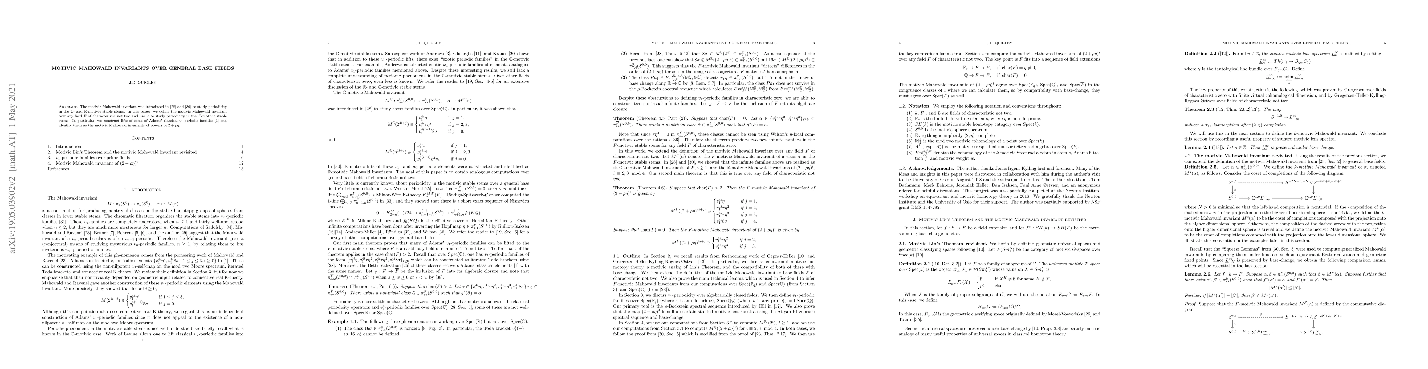 The motivic Mahowald invariant was introduced in \cite{Qui19a} and \cite{Qui19b} to study periodicity in the $\mathbb{C}$- and $\mathbb{R}$-motivic stable stems. In this paper, we define the motivic Mahowald invariant over any field $F$ of characteristic not two and use it to study periodicity in the $F$-motivic stable stems. In particular, we construct lifts of some of Adams' classical $v_1$-periodic families \cite{Ada66} and identify them as the motivic Mahowald invariants of powers of $2+\rho \eta$.