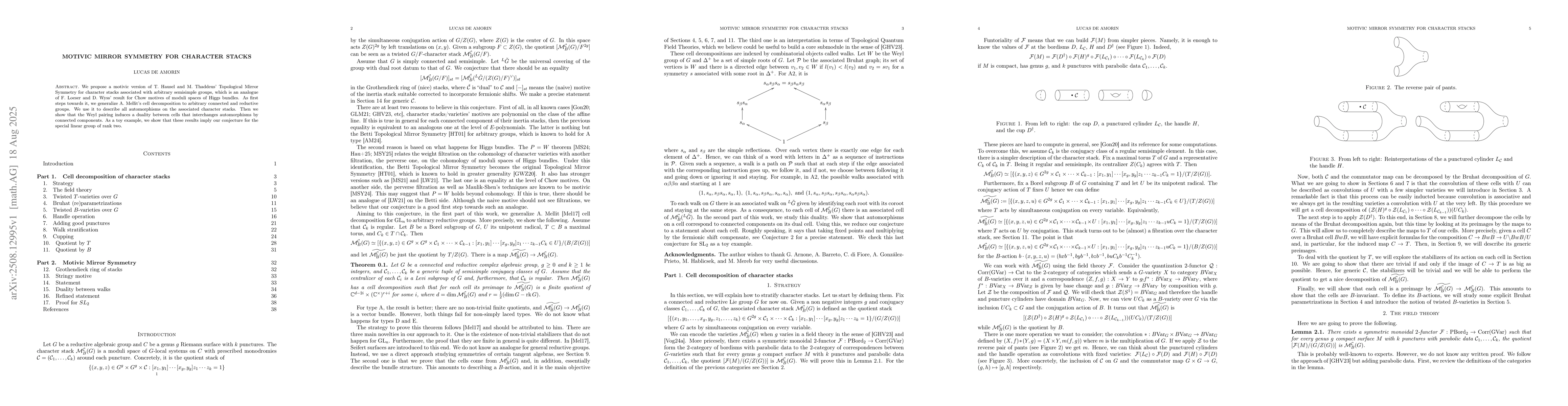 We propose a motivic version of T. Hausel and M. Thaddeus' Topological Mirror Symmetry for character stacks associated with arbitrary semisimple groups, which is an analogue of F. Loeser and D. Wyss' result for Chow motives of moduli spaces of Higgs bundles. As first steps towards it, we generalize A. Mellit's cell decomposition to arbitrary connected and reductive groups. We use it to describe all automorphisms on the associated character stacks. Then we show that the Weyl pairing induces a duality between cells that interchanges automorphisms by connected components. As a toy example, we show that these results imply our conjecture for the special linear group of rank two.