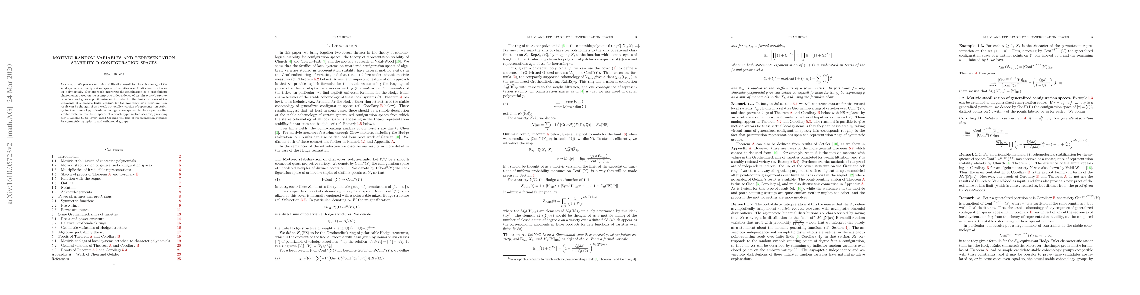 This paper proves motivic stabilization for the cohomology of configuration spaces using probabilistic interpretations of motivic random variables, showing representation stability for ordered configuration spaces. The stabilization is expressed through the exponents of a motivic Euler product for the Kapranov zeta function.