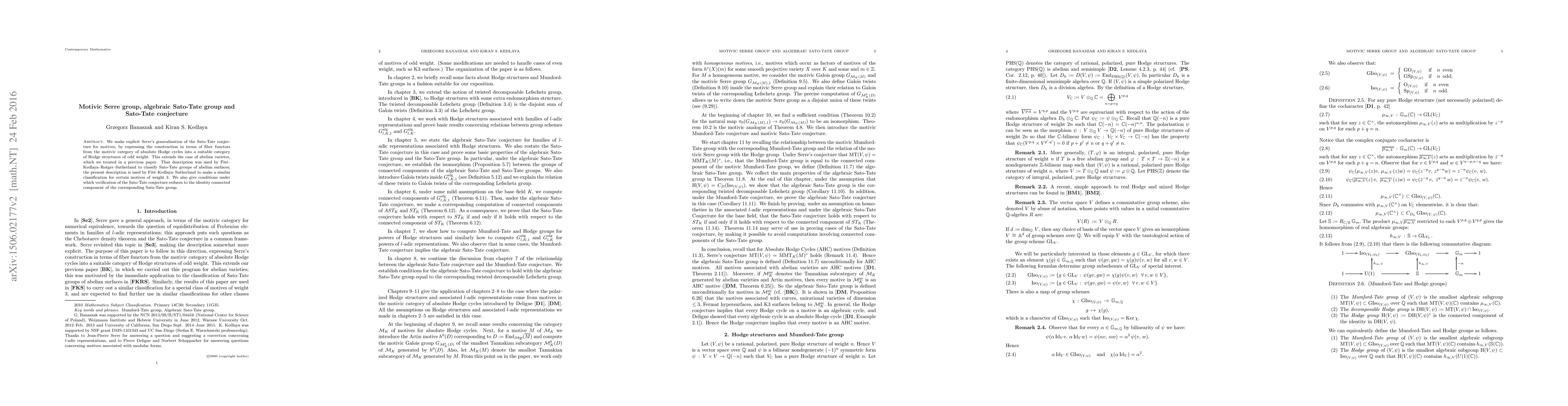 We make explicit Serre's generalization of the Sato-Tate conjecture for motives, by expressing the construction in terms of fiber functors from the motivic category of absolute Hodge cycles into a suitable category of Hodge structures of odd weight. This extends the case of abelian varietes, which we treated in a previous paper. That description was used by Fite--Kedlaya--Rotger--Sutherland to classify Sato-Tate groups of abelian surfaces; the present description is used by Fite--Kedlaya--Sutherland to make a similar classification for certain motives of weight 3. We also give conditions under which verification of the Sato-Tate conjecture reduces to the identity connected component of the corresponding Sato-Tate group.