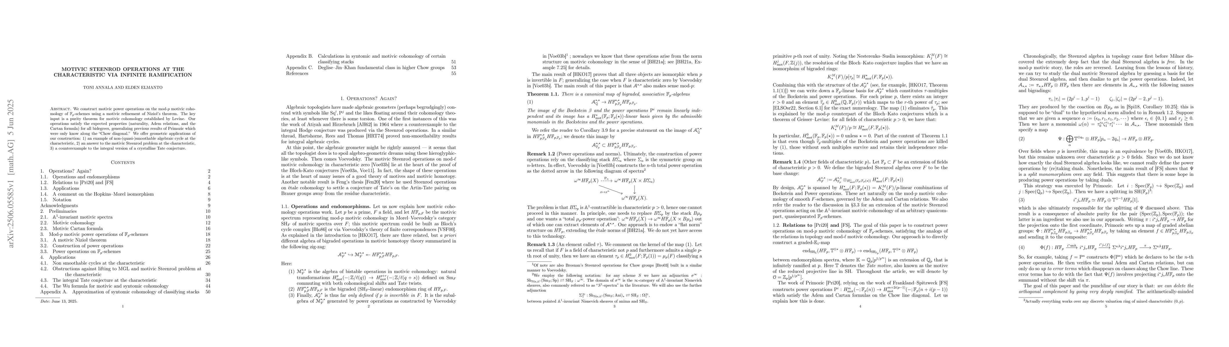 The paper constructs motivic power operations on the mod-$p$ motivic cohomology of $\Fb_p$-schemes using a motivic refinement of Nizioł's theorem, with key inputs from Levine's purity theorem for motivic cohomology.