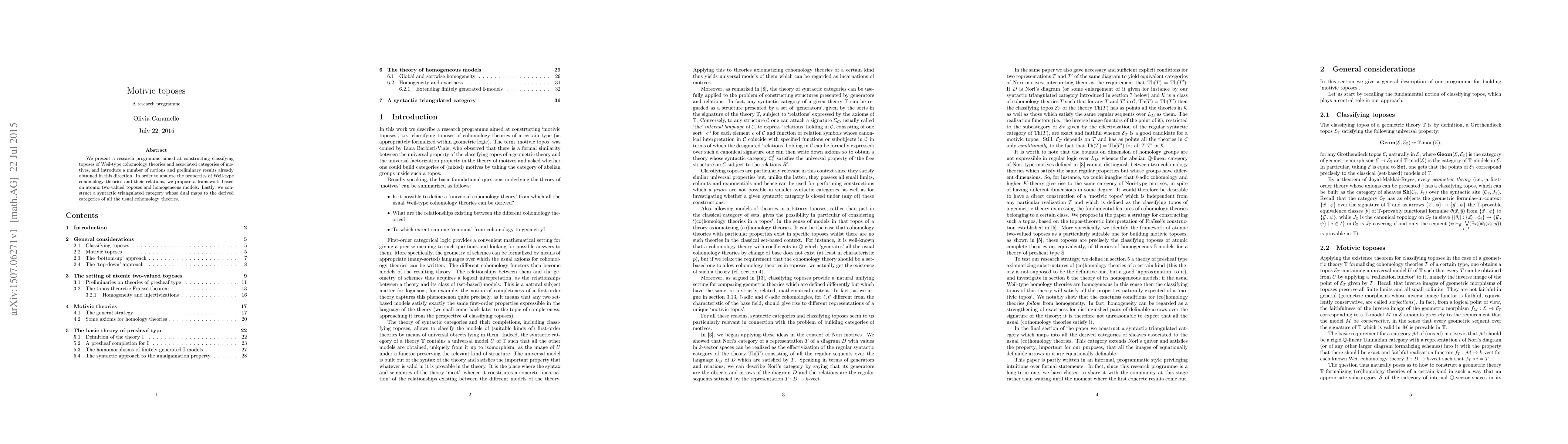 This paper outlines a research agenda to build classifying toposes for Weil-type cohomology theories and associated motive categories, employing atomic two-valued toposes and homogeneous models. It also constructs a syntactic triangulated category linked to the derived categories of standard cohomology theories.