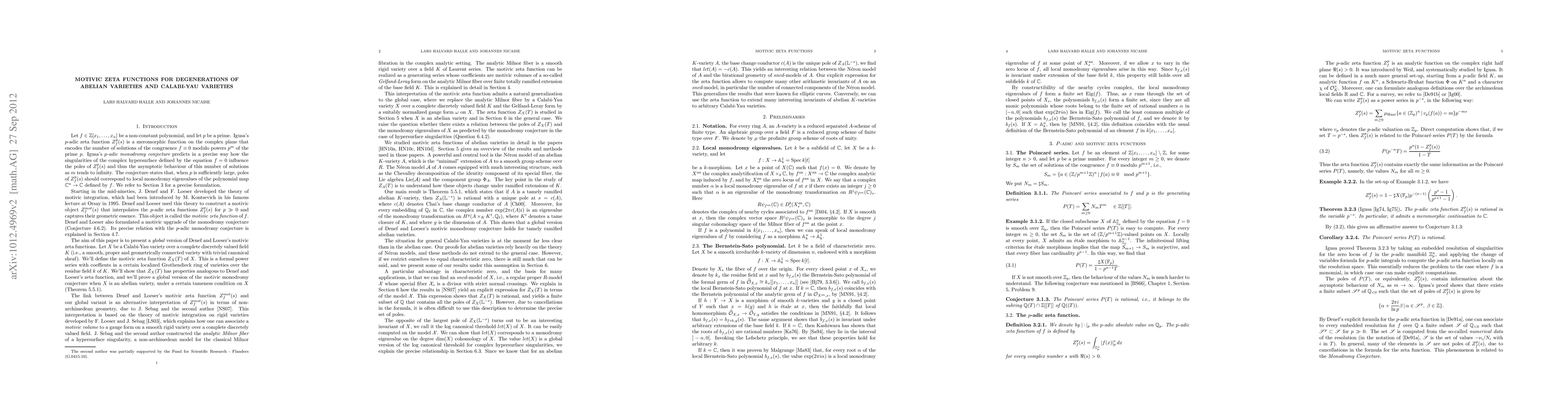 This paper surveys motivic zeta functions linked to abelian and Calabi-Yau varieties, connecting them to Denef and Loeser's zeta function for complex singularities, and examines the connection between zeta function poles and monodromy eigenvalues in $\ell$-adic cohomology.