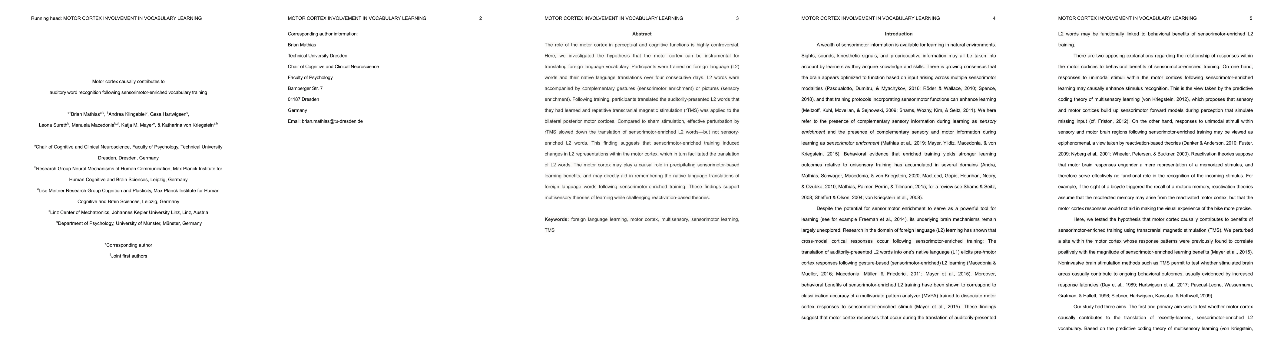 The role of the motor cortex in perceptual and cognitive functions is highly controversial. Here, we investigated the hypothesis that the motor cortex can be instrumental for translating foreign language vocabulary. Participants were trained on foreign language (L2) words and their native language translations over four consecutive days. L2 words were accompanied by complementary gestures (sensorimotor enrichment) or pictures (sensory enrichment). Following training, participants translated the auditorily-presented L2 words that they had learned and repetitive transcranial magnetic stimulation (rTMS) was applied to the bilateral posterior motor cortices. Compared to sham stimulation, effective perturbation by rTMS slowed down the translation of sensorimotor-enriched L2 words - but not sensory-enriched L2 words. This finding suggests that sensorimotor-enriched training induced changes in L2 representations within the motor cortex, which in turn facilitated the translation of L2 words. The motor cortex may play a causal role in precipitating sensorimotor-based learning benefits, and may directly aid in remembering the native language translations of foreign language words following sensorimotor-enriched training. These findings support multisensory theories of learning while challenging reactivation-based theories.