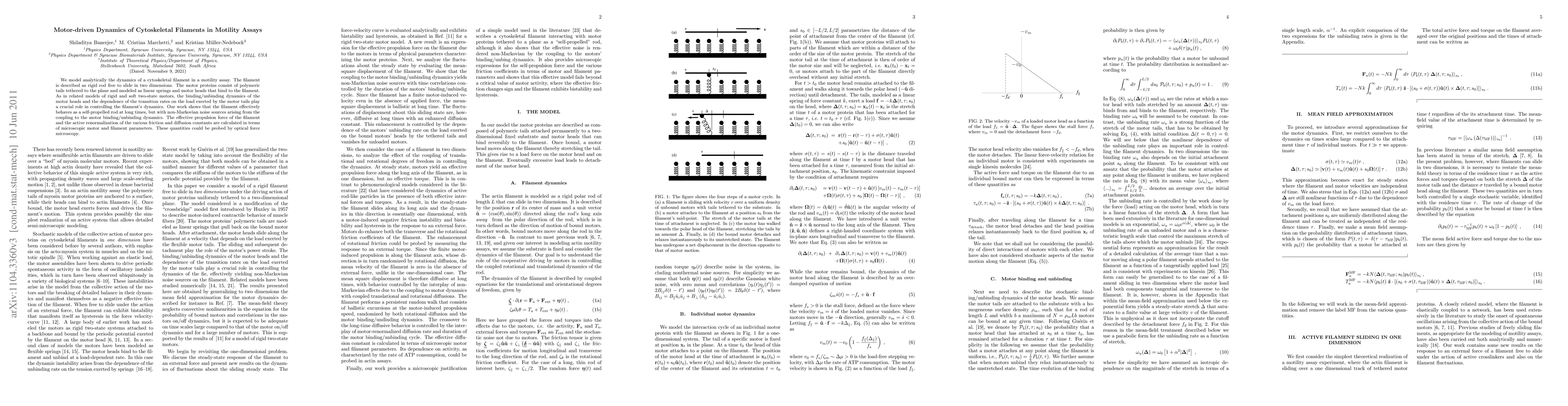 This paper analytically models the dynamics of cytoskeletal filaments driven by motor proteins in motility assays, showing that the filament behaves as a self-propelled rod with non-Markovian noise due to motor binding/unbinding dynamics. The study calculates effective propulsion force and friction/diffusion renormalization in terms of motor and filament parameters, potentially observable via optical force microscopy.