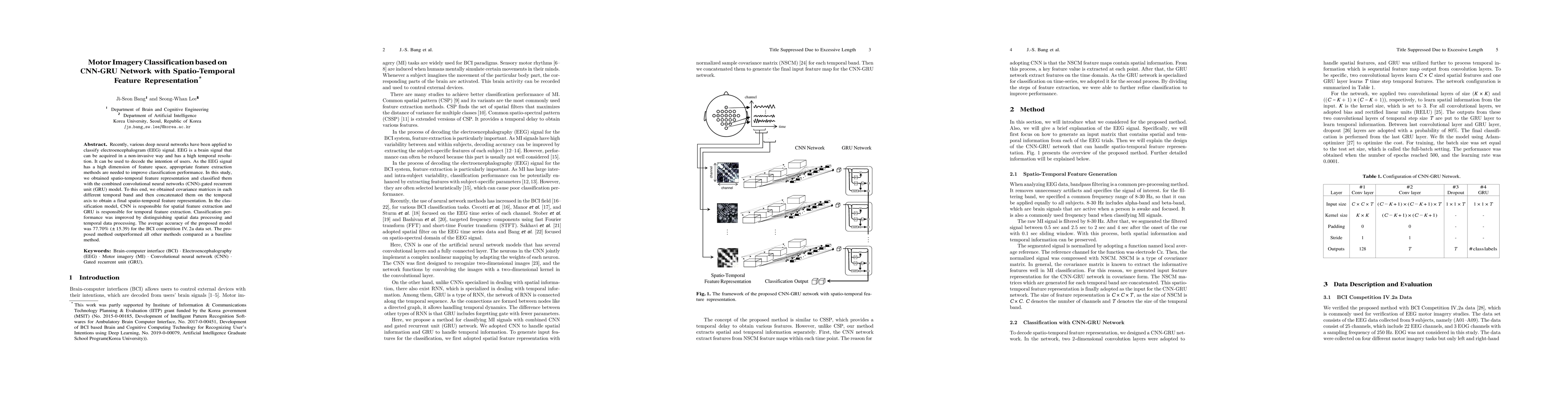 This paper proposes a CNN-GRU network for classifying motor imagery from EEG signals, utilizing spatio-temporal feature representation. The model extracts spatial features using CNN and temporal features using GRU, achieving an average accuracy of 77.70% on the BCI competition IV_2a dataset, outperforming other baseline methods.
