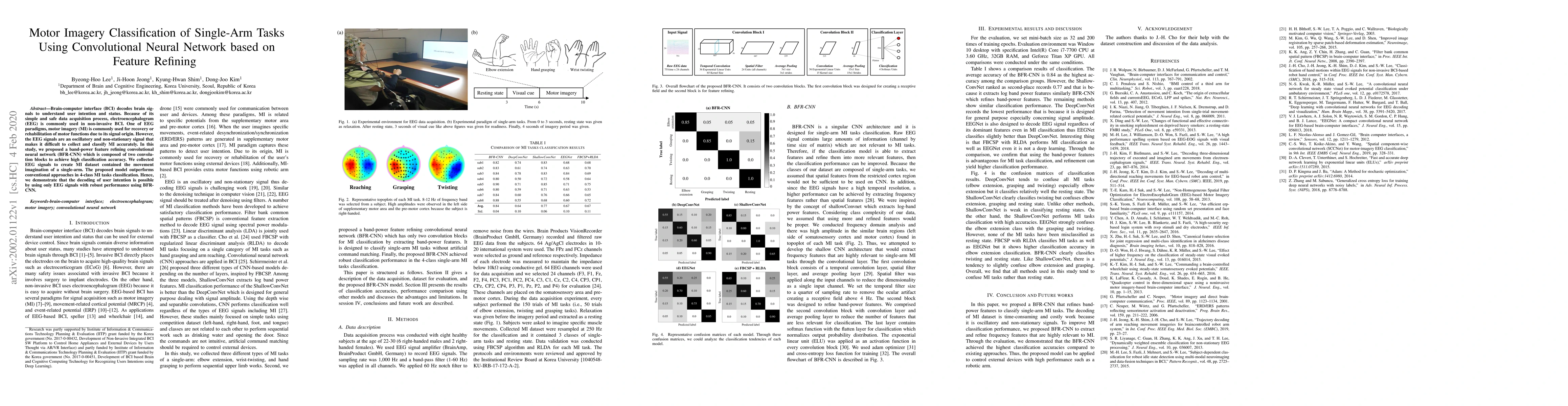 This study proposes a band-power feature refining convolutional neural network (BFR-CNN) to classify EEG signals for single-arm motor imagery tasks in a brain-computer interface. The BFR-CNN model, composed of two convolution blocks, achieves higher classification accuracy compared to conventional methods, demonstrating robust decoding of user intention.