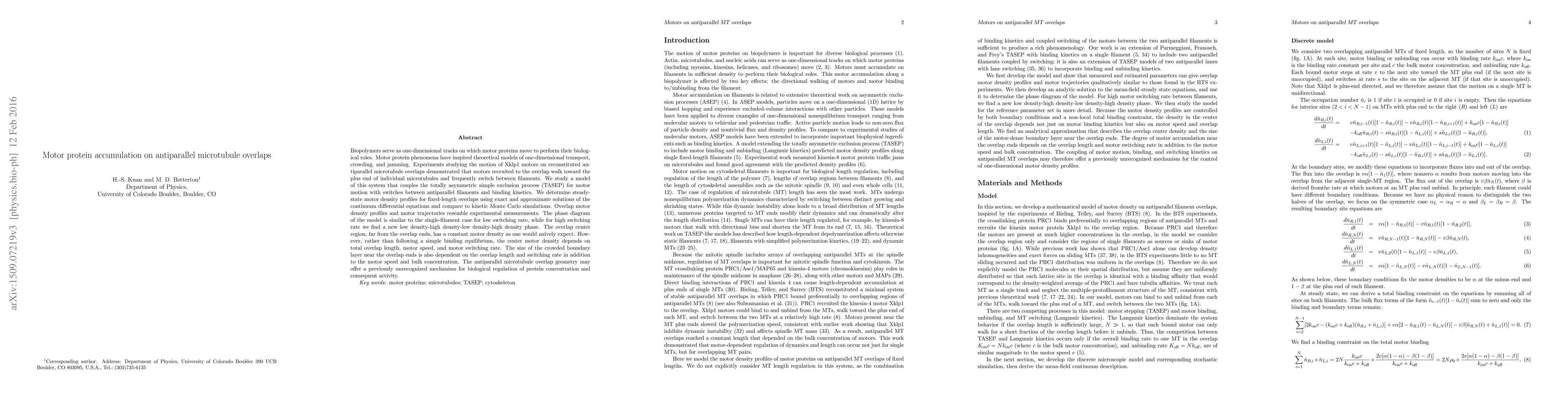 This research investigates motor protein dynamics on antiparallel microtubule overlaps, demonstrating that motors switch between filaments and accumulate in a manner dependent on overlap length, motor speed, and switching rates. The study reveals a complex phase diagram with distinct density phases, suggesting a novel regulatory mechanism for protein concentration in biological systems.