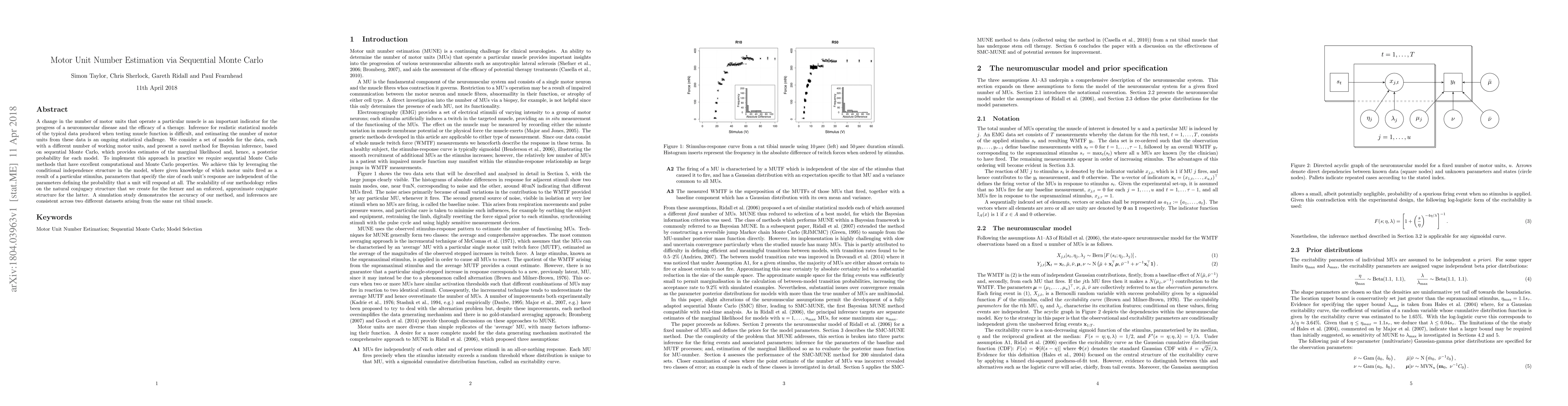 A change in the number of motor units that operate a particular muscle is an important indicator for the progress of a neuromuscular disease and the efficacy of a therapy. Inference for realistic statistical models of the typical data produced when testing muscle function is difficult, and estimating the number of motor units from these data is an ongoing statistical challenge. We consider a set of models for the data, each with a different number of working motor units, and present a novel method for Bayesian inference, based on sequential Monte Carlo, which provides estimates of the marginal likelihood and, hence, a posterior probability for each model. To implement this approach in practice we require sequential Monte Carlo methods that have excellent computational and Monte Carlo properties. We achieve this by leveraging the conditional independence structure in the model, where given knowledge of which motor units fired as a result of a particular stimulus, parameters that specify the size of each unit's response are independent of the parameters defining the probability that a unit will respond at all. The scalability of our methodology relies on the natural conjugacy structure that we create for the former and an enforced, approximate conjugate structure for the latter. A simulation study demonstrates the accuracy of our method, and inferences are consistent across two different datasets arising from the same rat tibial muscle.