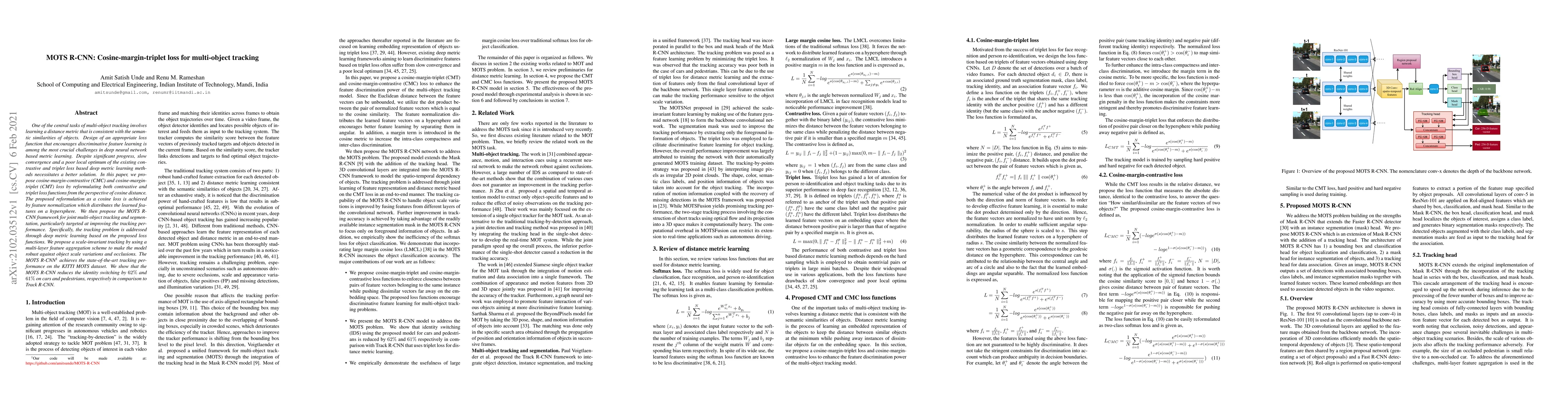 One of the central tasks of multi-object tracking involves learning a distance metric that is consistent with the semantic similarities of objects. The design of an appropriate loss function that encourages discriminative feature learning is among the most crucial challenges in deep neural network-based metric learning. Despite significant progress, slow convergence and a poor local optimum of the existing contrastive and triplet loss based deep metric learning methods necessitates a better solution. In this paper, we propose cosine-margin-contrastive (CMC) and cosine-margin-triplet (CMT) loss by reformulating both contrastive and triplet loss functions from the perspective of cosine distance. The proposed reformulation as a cosine loss is achieved by feature normalization which distributes the learned features on a hypersphere. We then propose the MOTS R-CNN framework for joint multi-object tracking and segmentation, particularly targeted at improving the tracking performance. Specifically, the tracking problem is addressed through deep metric learning based on the proposed loss functions. We propose a scale-invariant tracking by using a multi-layer feature aggregation scheme to make the model robust against object scale variations and occlusions. The MOTS R-CNN achieves the state-of-the-art tracking performance on the KITTI MOTS dataset. We show that the MOTS R-CNN reduces the identity switching by $62\%$ and $61\%$ on cars and pedestrians, respectively in comparison to Track R-CNN.