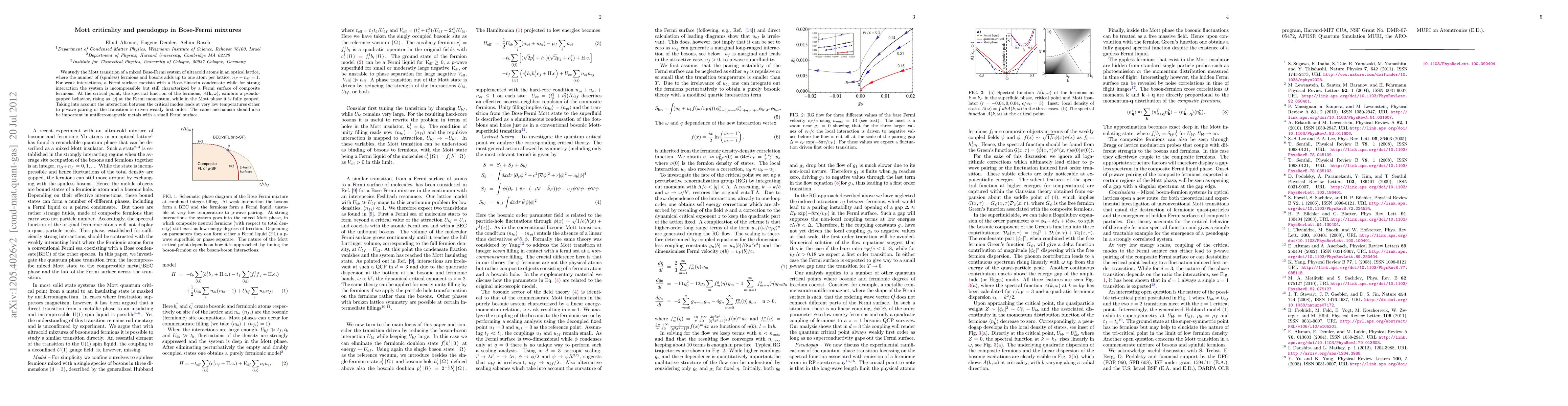 We study the Mott transition of a mixed Bose-Fermi system of ultracold atoms in an optical lattice, where the number of (spinless) fermions and bosons adds up to one atom per lattice, n_F+n_B=1. For weak interactions, a Fermi surface coexists with a Bose-Einstein condensate while for strong interaction the system is incompressible but still characterized by a Fermi surface of composite fermions. At the critical point, the spectral function of the fermions, A(k,w), exhibits a pseudo-gapped behavior, rising as |w| at the Fermi momentum, while in the Mott phase it is fully gapped. Taking into account the interaction between the critical modes leads at very low temperatures either to p-wave pairing or the transition is driven weakly first order. The same mechanism should also be important in antiferromagnetic metals with a small Fermi surface.