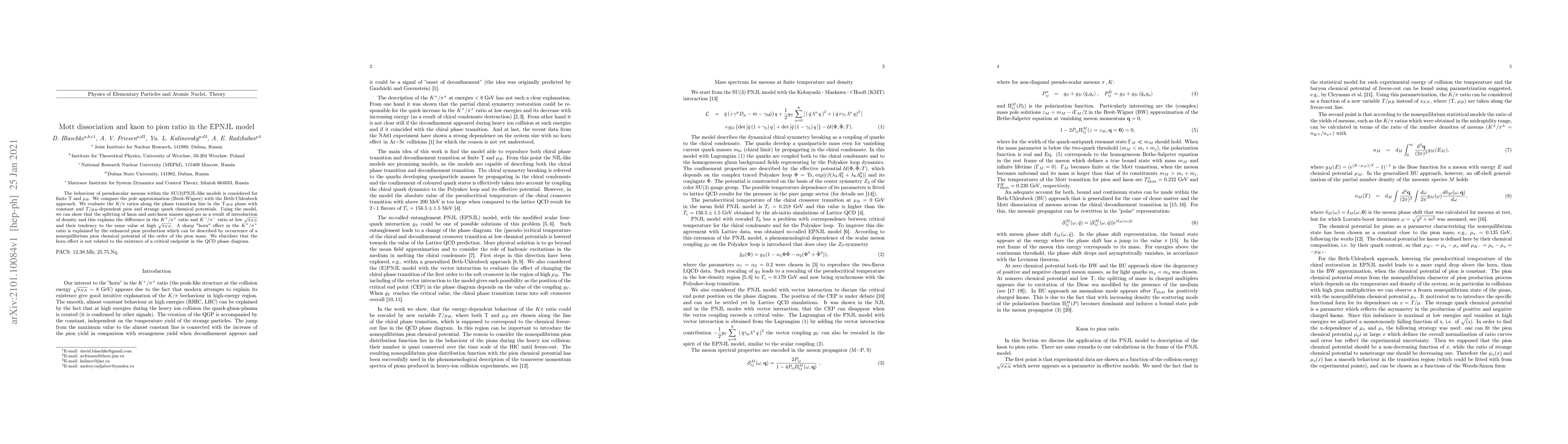 The behaviour of pseudoscalar mesons within the SU(3)PNJL-like models is considered for finite T and $\mu_B$. We compare the pole approximation (Breit-Wigner) with the Beth-Uhlenbeck approach. We evaluate the $K/\pi$ ratios along the phase transition line in the T-$\mu_B$ plane with constant and $T/\mu_B$-dependent pion and strange quark chemical potentials. Using the model, we can show that the splitting of kaon and anti-kaon masses appears as a result of introduction of density and this explains the difference in the $K^+/\pi^+$ ratio and $K^-/\pi^-$ ratio at low $\sqrt{s_{NN}}$ and their tendency to the same value at high $\sqrt{s_{NN}}$. A sharp "horn" effect in the $K^+/\pi^+$ ratio is explained by the enhanced pion production which can be described by occurrence of a nonequilibrium pion chemical potential of the order of the pion mass. We elucidate that the horn effect is not related to the existence of a critical endpoint in the QCD phase diagram.