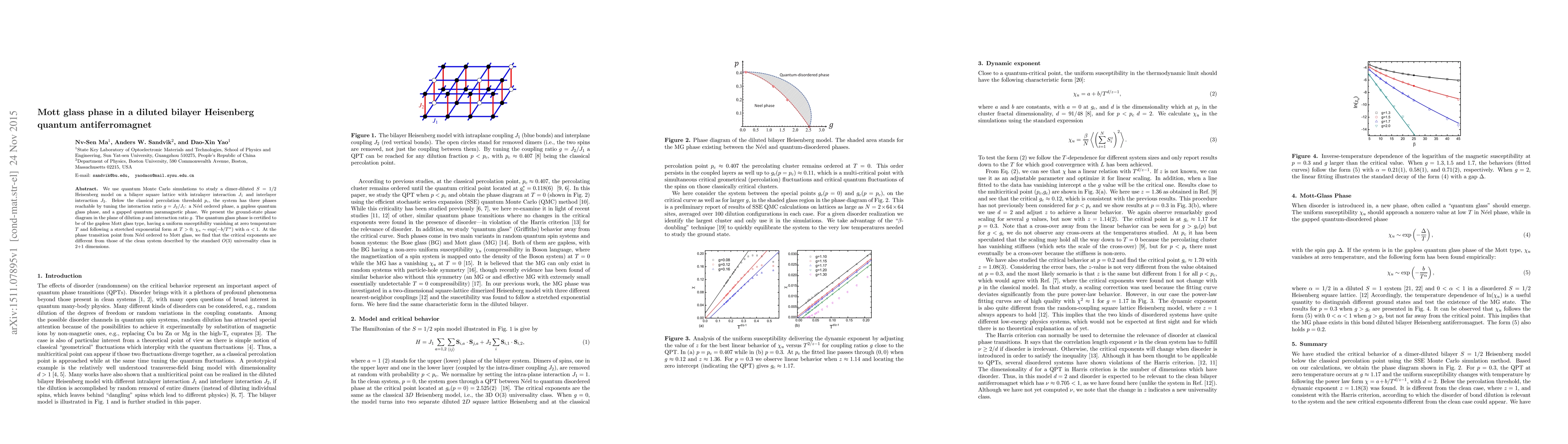 We use quantum Monte Carlo simulations to study a dimer-diluted $S=1/2$ Heisenberg model on a bilayer square lattice with intralayer interaction $J_{1}$ and interlayer interaction $J_{2}$. Below the classical percolation threshold $p_c$, the system has three phases reachable by tuning the interaction ratio $g=J_{2}/J_{1}$: a N$\acute{e}$el ordered phase, a gapless quantum glass phase, and a gapped quantum paramagnetic phase. We present the ground-state phase diagram in the plane of dilution $p$ and interaction ratio $g$. The quantum glass phase is certified to be of the gapless Mott glass type, having a uniform susceptibility vanishing at zero temperature $T$ and following a stretched exponential form at $T>0$; $\chi_u \sim \exp(-b/T^{\alpha})$ with $\alpha < 1$. At the phase transition point from N$\acute{e}$el ordered to Mott glass, we find that the critical exponents are different from those of the clean system described by the standard $O(3)$ universality class in 2+1 dimensions.