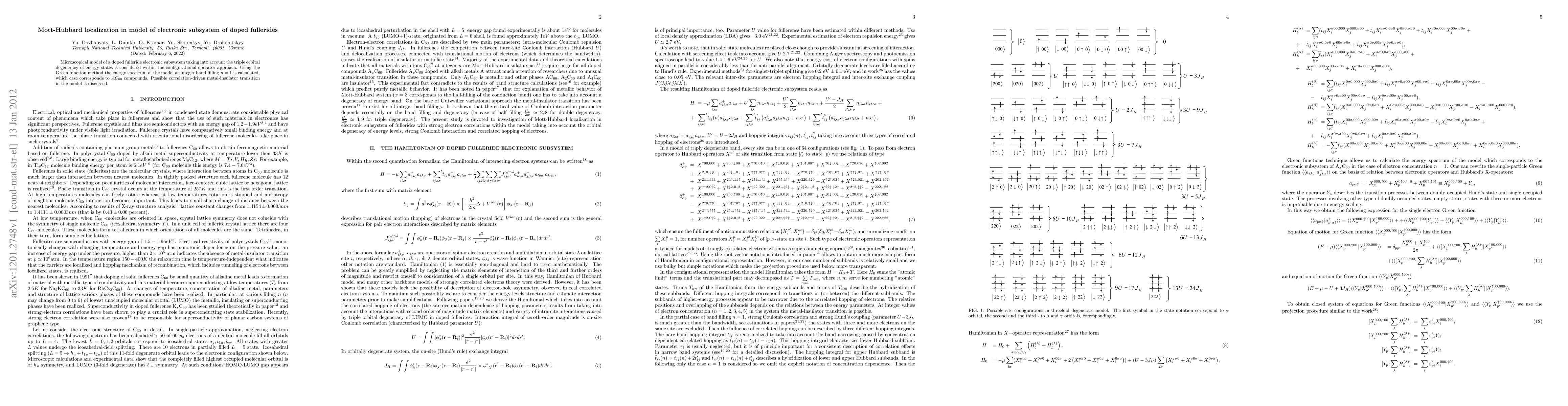 Microscopical model of a doped fulleride electronic subsystem taking into account the triple orbital degeneracy of energy states is considered within the configurational-operator approach. Using the Green function method the energy spectrum of the model at integer band filling $n=1$ is calculated, which case corresponds to $AC_{60}$ compounds. Possible correlation-driven metal-insulator transition in the model is discussed.