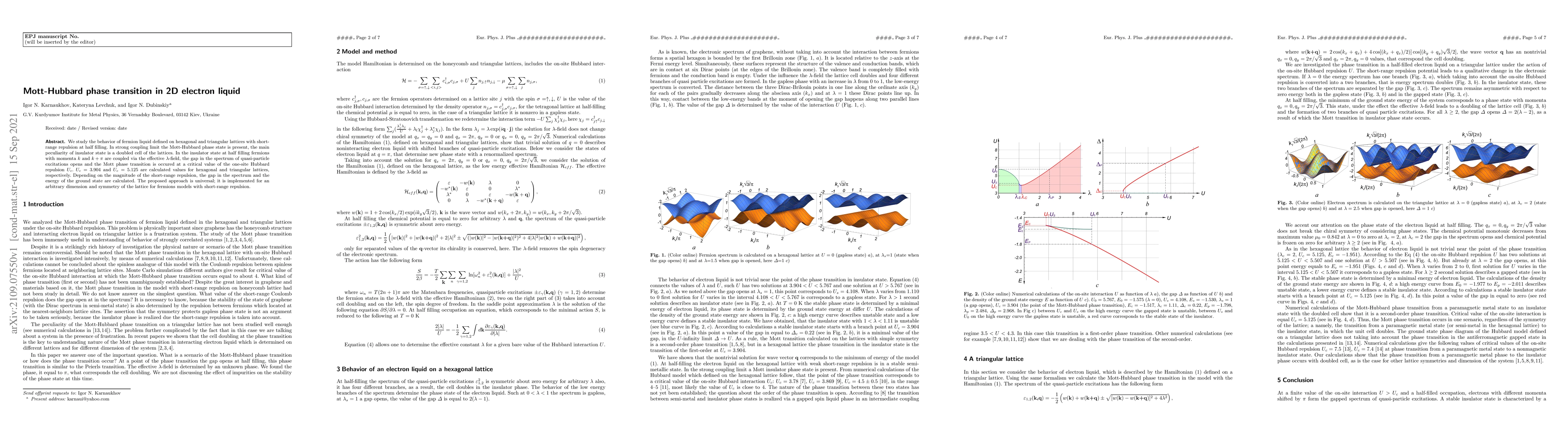 This paper investigates the Mott-Hubbard phase transition in 2D electron liquids on hexagonal and triangular lattices, revealing the transition to an insulating state at half filling due to strong coupling and short-range repulsion. Critical values for the Hubbard repulsion, $U_c$, are calculated for both lattices, demonstrating the universality of the approach across different dimensions and lattice symmetries.