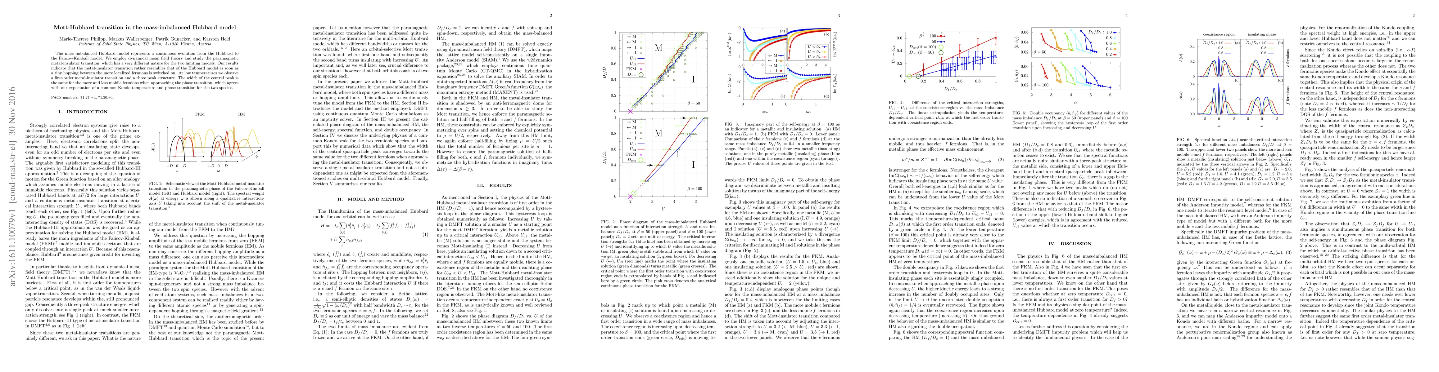 The study of the mass-imbalanced Hubbard model reveals a paramagnetic metal-insulator transition resembling the Hubbard model when slight hopping is introduced. At low temperatures, a first-order transition and a three-peak structure emerge, with a common Kondo temperature indicating a unified phase transition for both fermion species.