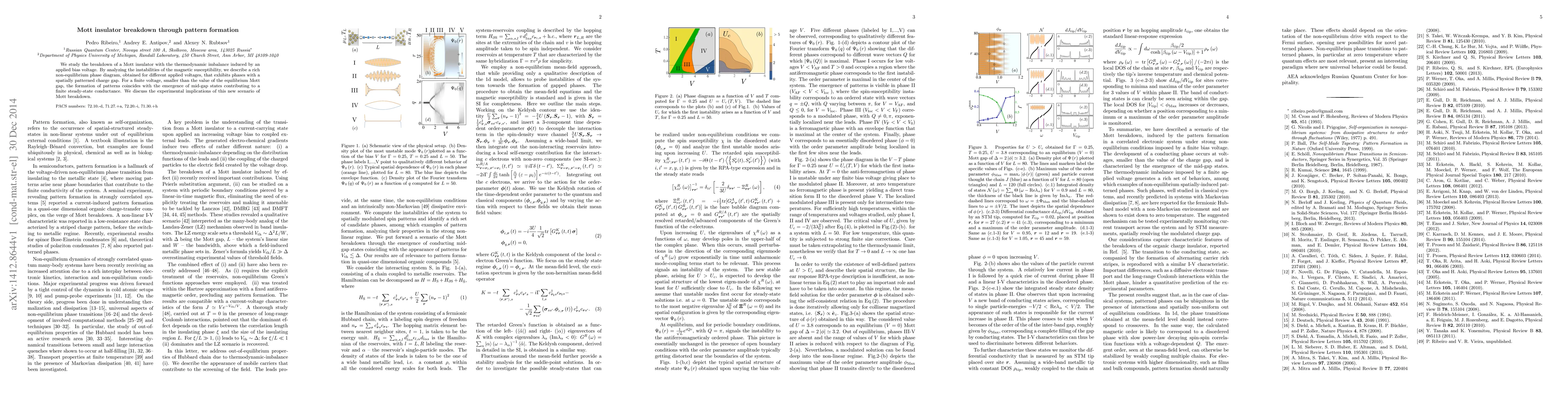 We study the breakdown of a Mott insulator with the thermodynamic imbalance induced by an applied bias voltage. By analyzing the instabilities of the magnetic susceptibility, we describe a rich non-equilibrium phase diagram, obtained for different applied voltages, that exhibits phases with a spatially patterned charge gap. For a finite voltage, smaller than the value of the equilibrium Mott gap, the formation of patterns coincides with the emergence of mid-gap states contributing to a finite steady-state conductance. We discuss the experimental implications of this new scenario of Mott breakdown.