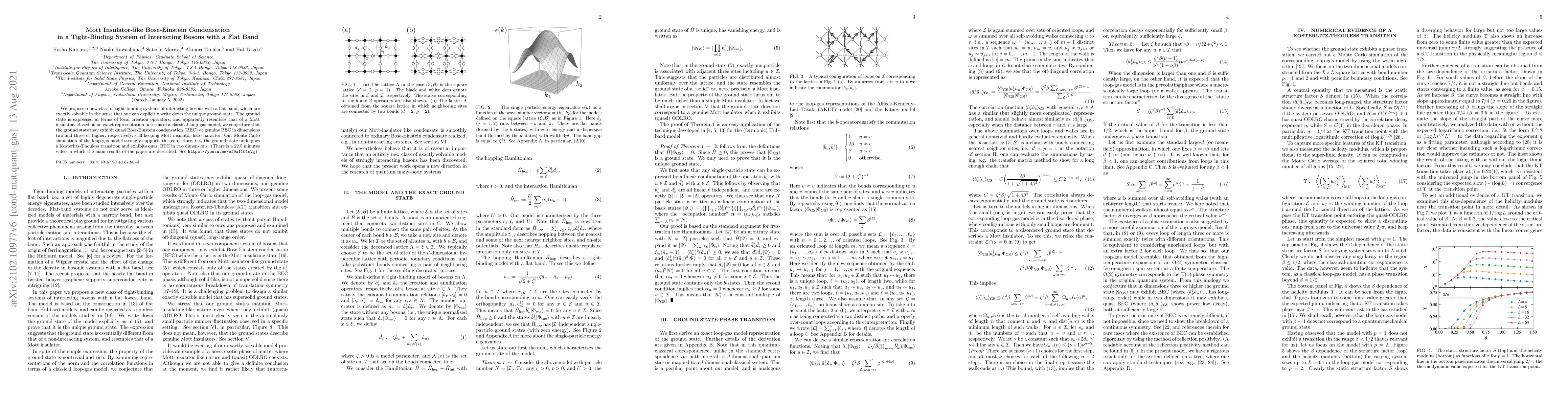This paper proposes a new class of tight-binding systems of interacting bosons with a flat band, showing that their ground state resembles a Mott insulator and may exhibit quasi Bose-Einstein condensation in two dimensions, supported by Monte Carlo simulations. The exact solution and classical loop-gas model suggest a Kosterlitz-Thouless transition leading to quasi BEC.