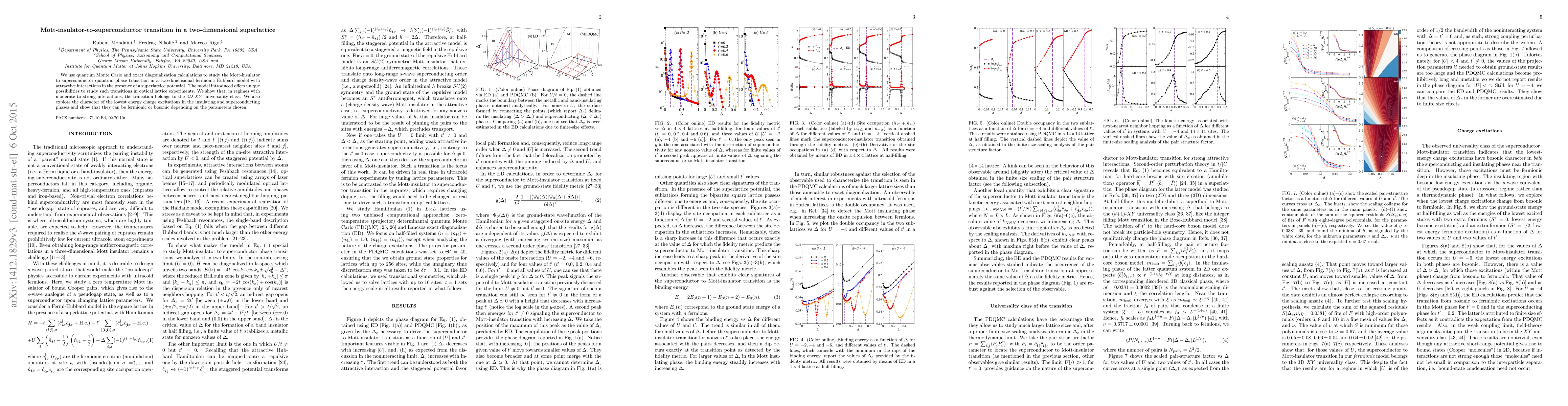 This paper investigates the Mott-insulator to superconductor transition in a two-dimensional fermionic Hubbard model with attractive interactions under a superlattice potential using quantum Monte Carlo and exact diagonalization. The study reveals that the transition belongs to the 3D-XY universality class in moderate to strong interaction regimes and explores the nature of charge excitations, which can be either fermionic or bosonic.