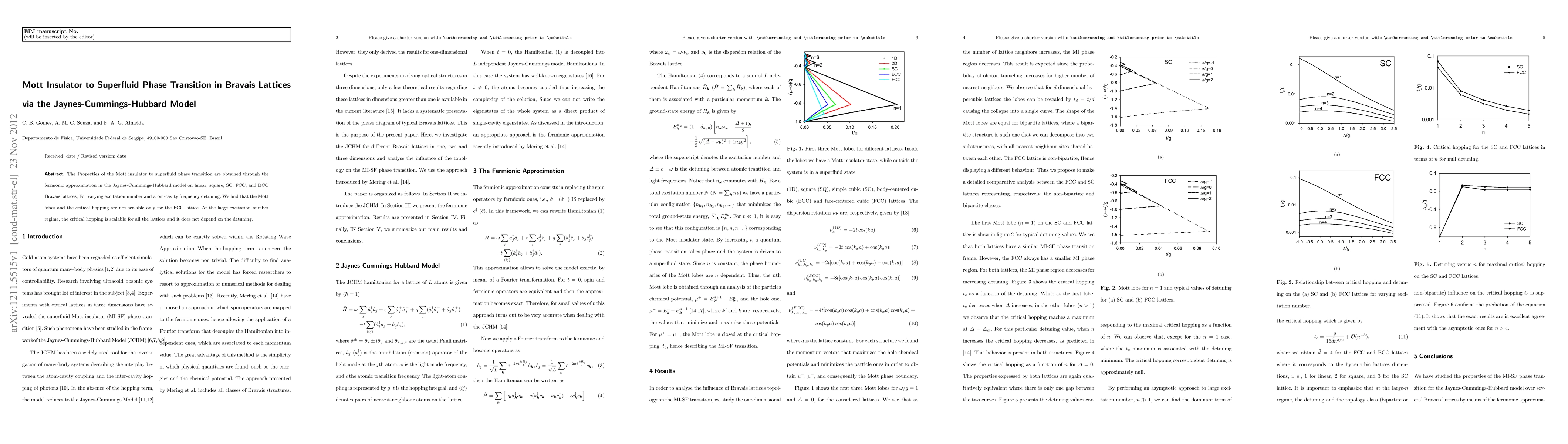 The study investigates the Mott insulator to superfluid phase transition in various Bravais lattices using the Jaynes-Cummings-Hubbard model, revealing that the FCC lattice exhibits non-scalable Mott lobes and critical hopping, while the latter becomes scalable and detuning-independent at large excitation numbers across all lattices.