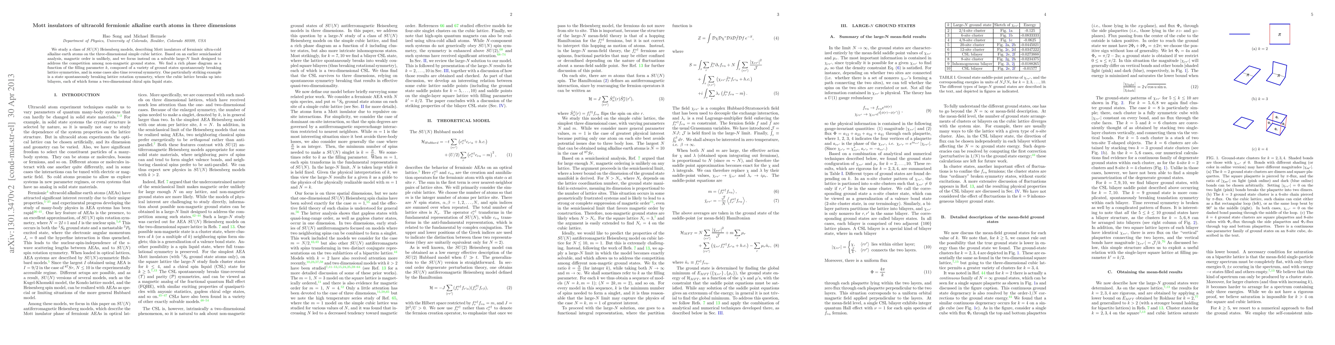 This research explores SU(N) Heisenberg models for Mott insulators of ultracold fermionic alkaline earth atoms, revealing a diverse phase diagram with various non-magnetic ground states and spontaneous symmetry breaking, including a unique state where the cubic lattice divides into bilayers forming chiral spin liquid states.