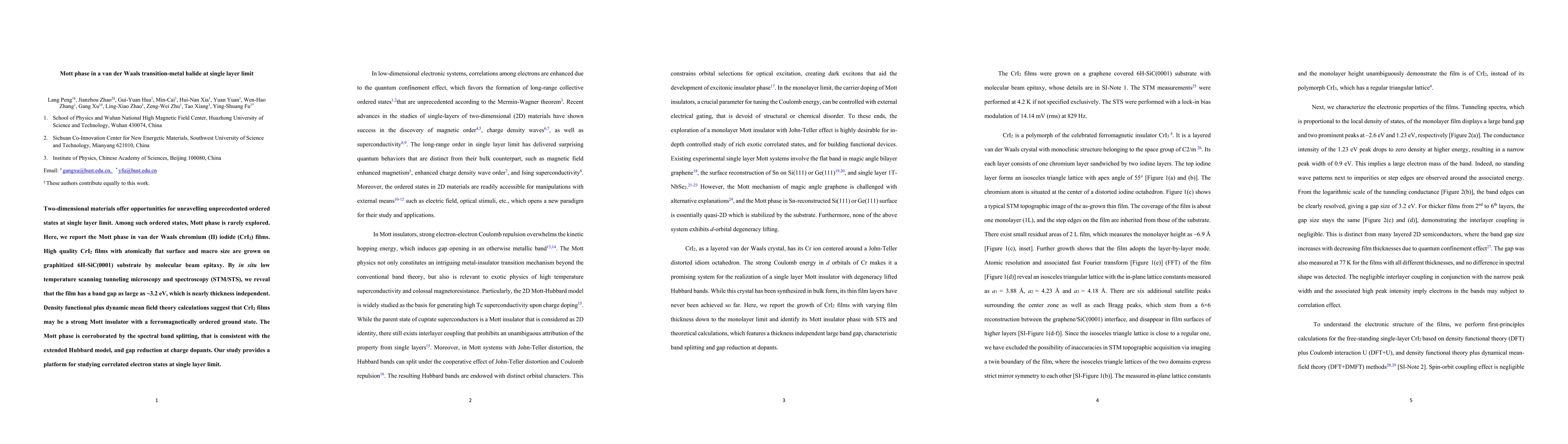 This paper reports the discovery of a Mott phase in high-quality, atomically thin van der Waals CrI2 films grown on a substrate, characterized by a large, thickness-independent band gap of ~3.2 eV. The study uses STM/STS and theoretical calculations to confirm the strong Mott insulating behavior and ferromagnetic order, offering a new platform for exploring correlated electron states in two-dimensional materials.