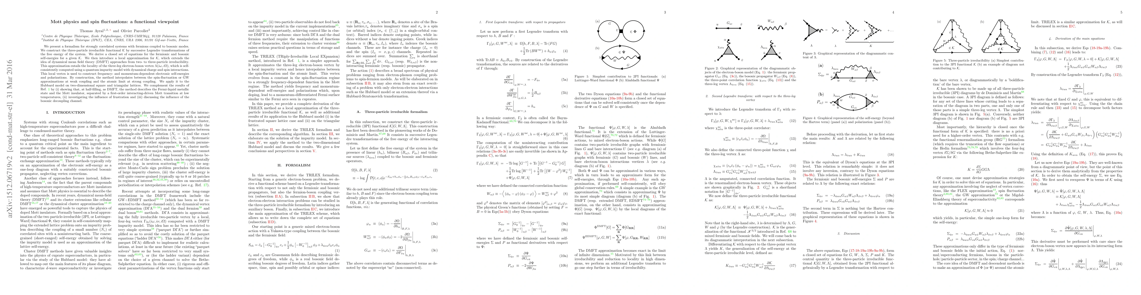 We present a formalism for strongly correlated systems with fermions coupled to bosonic modes. We construct the three-particle irreducible functional $\mathcal{K}$ by successive Legendre transformations of the free energy of the system. We derive a closed set of equations for the fermionic and bosonic self-energies for a given $\mathcal{K}$. We then introduce a local approximation for $\mathcal{K}$, which extends the idea of dynamical mean field theory (DMFT) approaches from two- to three-particle irreducibility. This approximation entails the locality of the three-leg electron-boson vertex $\Lambda(i\omega,i\Omega)$, which is self-consistently computed using a quantum impurity model with dynamical charge and spin interactions. This local vertex is used to construct frequency- and momentum-dependent electronic self-energies and polarizations. By construction, the method interpolates between the spin-fluctuation or GW approximations at weak coupling and the atomic limit at strong coupling. We apply it to the Hubbard model on two-dimensional square and triangular lattices. We complement the results of Phys.Rev. B 92, 115109 by (i) showing that, at half-filling, as DMFT, the method describes the Fermi-liquid metallic state and the Mott insulator, separated by a first-order interacting-driven Mott transition at low temperatures, (ii) investigating the influence of frustration and (iii) discussing the influence of the bosonic decoupling channel.