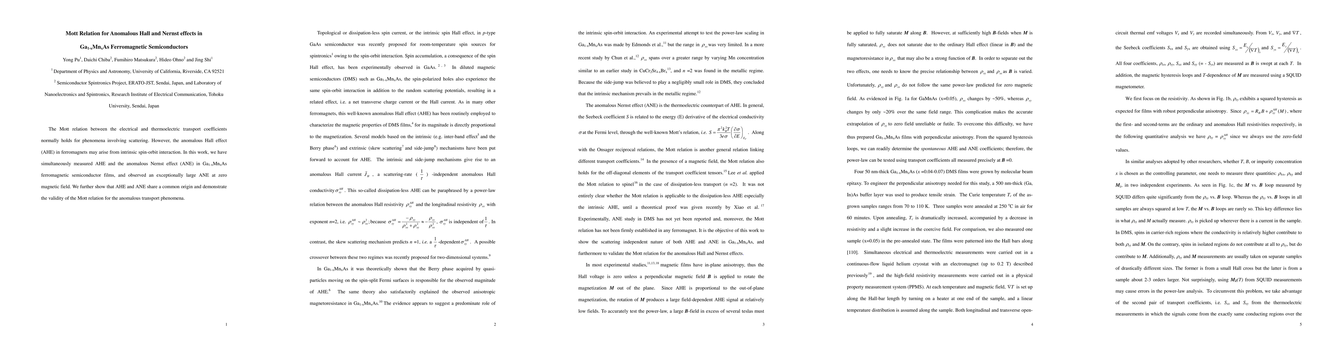 This study investigates the Mott relation in Ga1-xMnxAs ferromagnetic semiconductor films, revealing a large anomalous Nernst effect (ANE) at zero magnetic field alongside the anomalous Hall effect (AHE). The research demonstrates that both AHE and ANE share a common origin and validates the Mott relation for these anomalous transport phenomena.