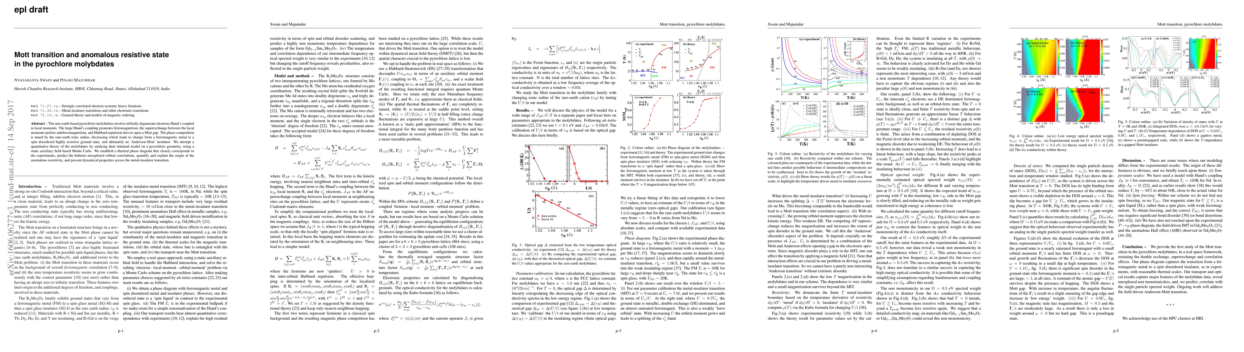The rare-earth based pyrochlore molybdates involve orbitally degenerate electrons Hund's coupled to local moments. The large Hund's coupling promotes ferromagnetism, the superexchange between the local moments prefers antiferromagnetism, and Hubbard repulsion tries to open a Mott gap. The phase competition is tuned by the rare-earth ionic radius, decreasing which leads to change from a ferromagnetic metal to a spin disordered highly resistive ground state, and ultimately an 'Anderson-Mott' insulator. We attempt a quantitative theory of the molybdates by studying their minimal model on a pyrochlore geometry, using a static auxiliary field based Monte Carlo. We establish a thermal phase diagram that closely corresponds to the experiments, predict the hitherto unexplored orbital correlations, quantify and explain the origin of the anomalous resistivity, and present dynamical properties across the metal-insulator transition.