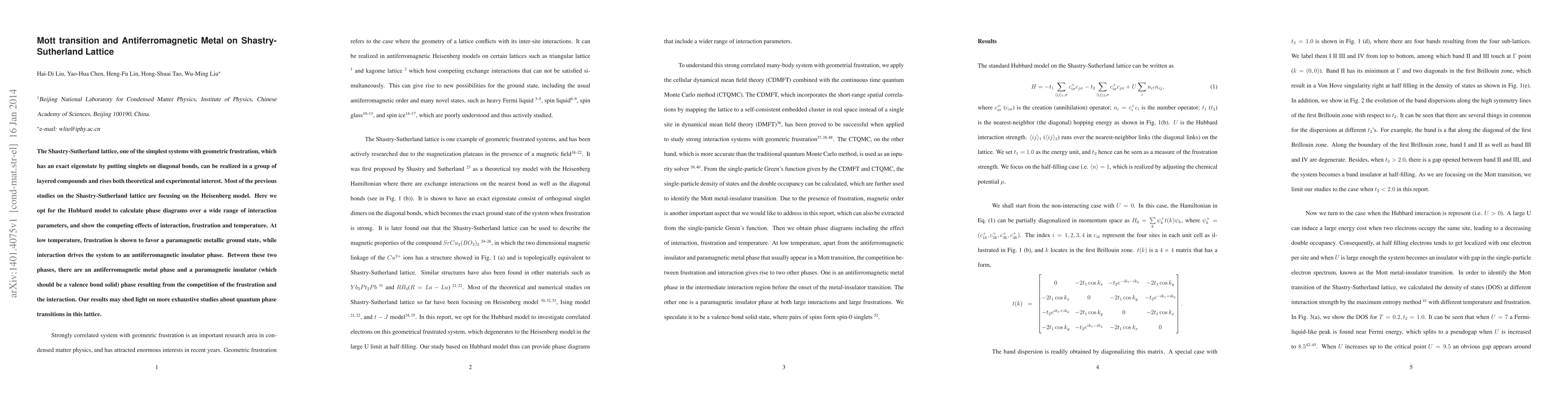 This paper investigates the Mott transition and antiferromagnetic metal phases on the Shastry-Sutherland lattice using the Hubbard model. It reveals that frustration favors a paramagnetic metallic ground state while interactions drive the system to an antiferromagnetic insulator, with an antiferromagnetic metal phase emerging between these competing states.