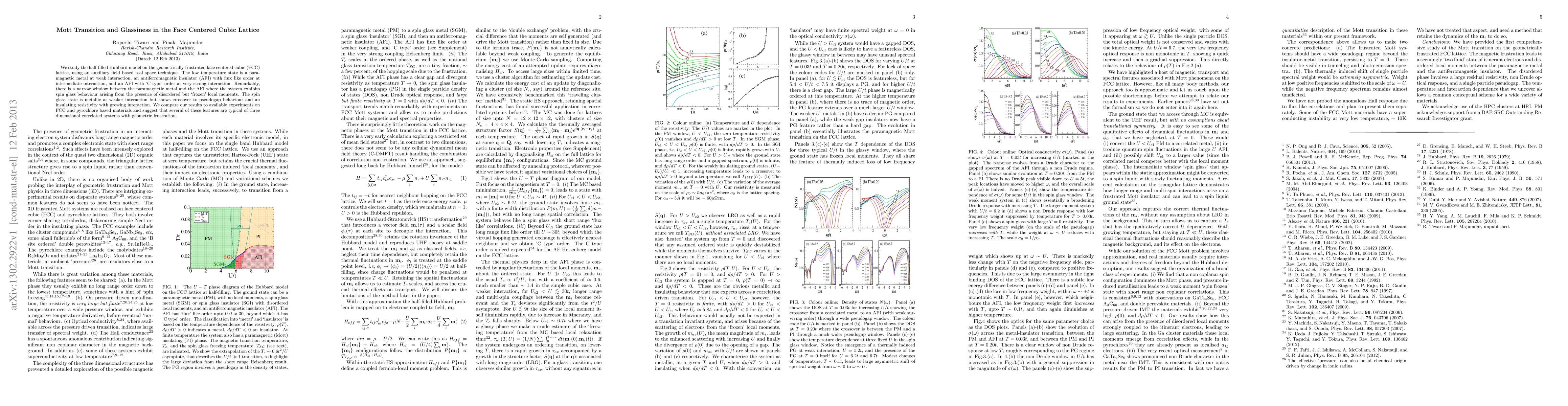 We study the half-filled Hubbard model on the geometrically frustrated face centered cubic (FCC) lattice, using an auxiliary field based real space technique. The low temperature state is a paramagnetic metal at weak interaction, an antiferromagnetic insulator (AFI) with flux like order at intermediate interaction, and an AFI with `C type' order at very strong interaction. Remarkably, there is a narrow window between the paramagnetic metal and the AFI where the system exhibits spin glass behaviour arising from the presence of disordered but `frozen' local moments. The spin glass state is metallic at weaker interaction but shows crossover to pseudogap behaviour and an insulating resistivity with growing interaction. We compare our results to available experiments on FCC and pyrochlore based materials and suggest that several of these features are typical of three dimensional correlated systems with geometric frustration.