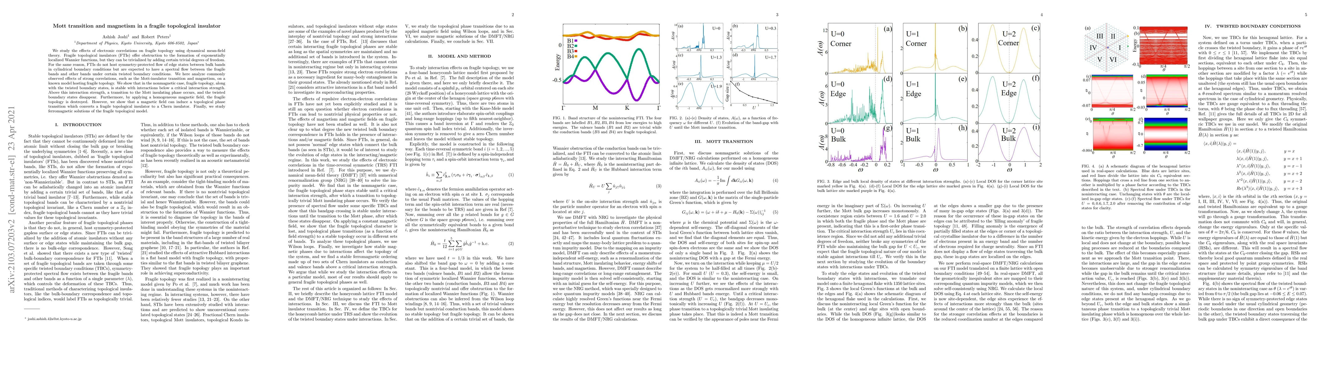 We study the effects of electronic correlations on fragile topology using dynamical mean-field theory. Fragile topological insulators (FTIs) offer obstruction to the formation of exponentially localized Wannier functions, but they can be trivialized by adding certain trivial degrees of freedom. For the same reason, FTIs do not host symmetry-protected flow of edge states between bulk bands in cylindrical boundary conditions but are expected to have a spectral flow between the fragile bands and other bands under certain twisted boundary conditions. We here analyze commonly observed effects of strong correlations, such as the Mott-insulator transition and magnetism, on a known model hosting fragile topology. We show that in the nonmagnetic case, fragile topology, along with the twisted boundary states, is stable with interactions below a critical interaction strength. Above this interaction strength, a transition to the Mott insulating phase occurs, and the twisted boundary states disappear. Furthermore, by applying a homogeneous magnetic field, the fragile topology is destroyed. However, we show that a magnetic field can induce a topological phase transition which converts a fragile topological insulator to a Chern insulator. Finally, we study ferromagnetic solutions of the fragile topological model.