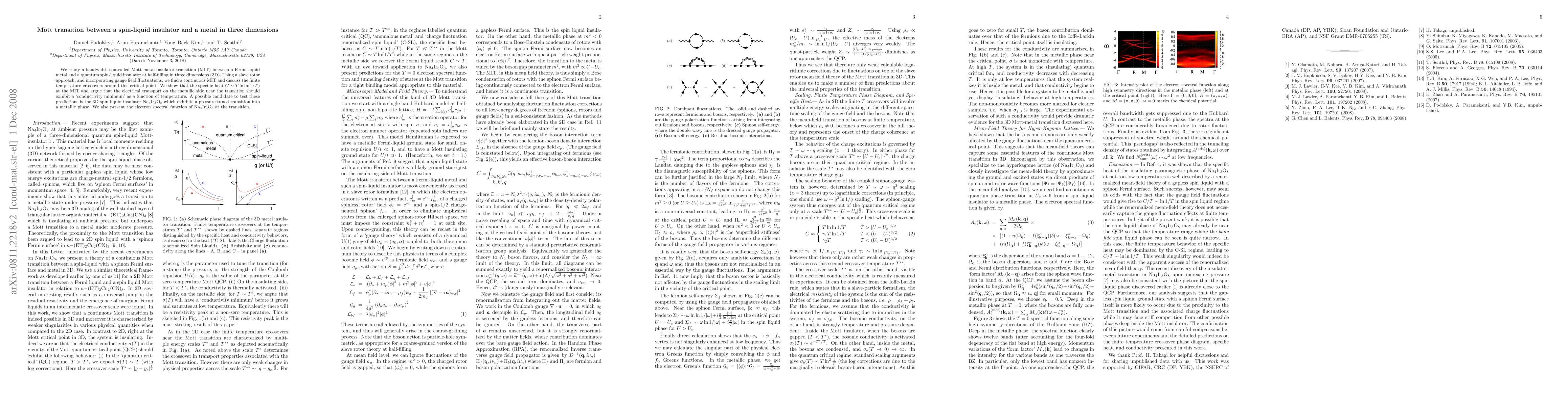 This study investigates a Mott transition in three dimensions between a spin-liquid insulator and a Fermi liquid metal, employing a slave rotor approach. It reveals a continuous metal-insulator transition and predicts a specific heat behavior and conductivity minimum near the transition, with Na4Ir3O8 as a potential experimental test case.