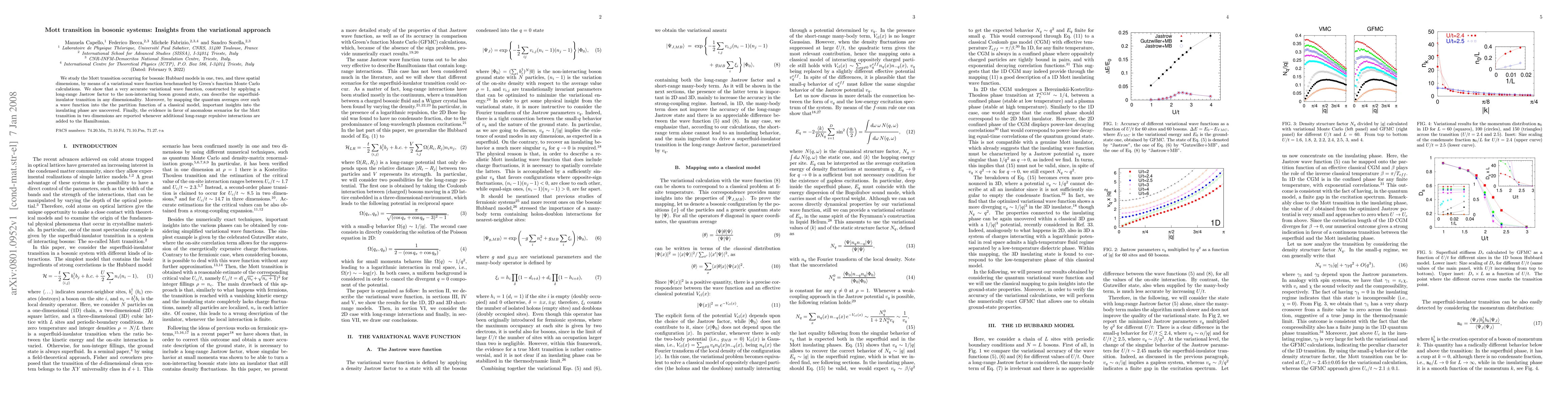 This paper investigates the Mott transition in bosonic Hubbard models across different dimensions using a variational wave function approach. It demonstrates that a sophisticated variational wave function can accurately describe the superfluid-insulator transition and reveals insights into the insulating phase through a classical model mapping. Additionally, it finds evidence for anomalous transition scenarios in two dimensions when long-range interactions are included.