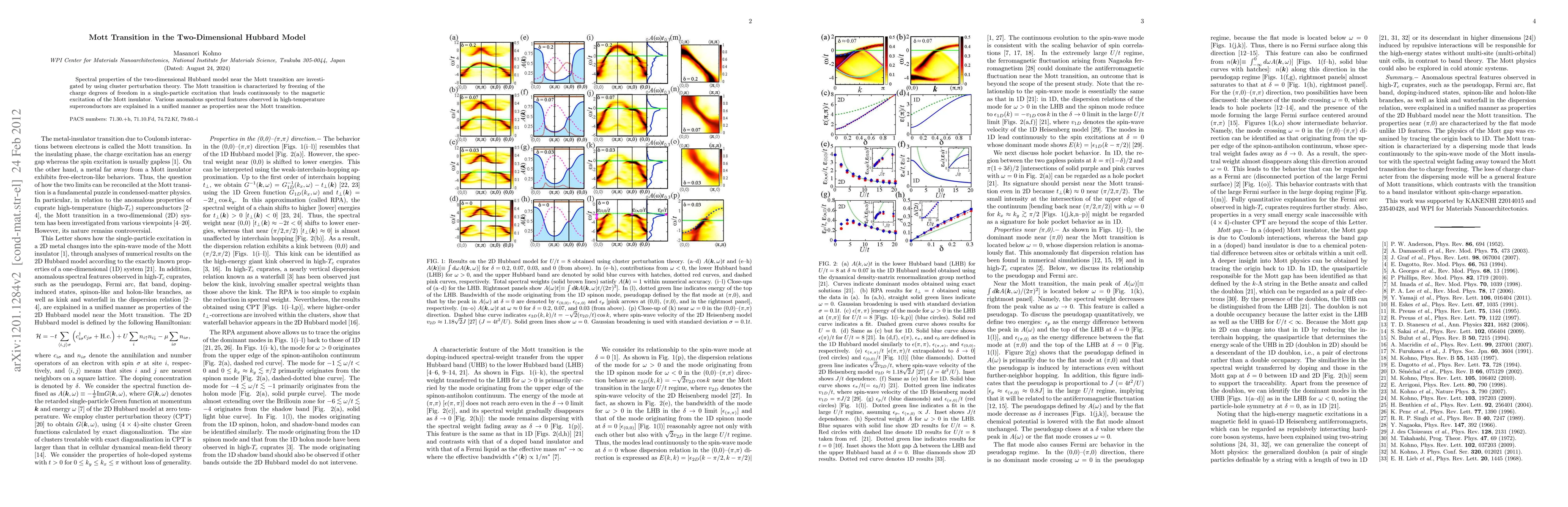 The study investigates the spectral properties of the two-dimensional Hubbard model near the Mott transition using cluster perturbation theory, revealing how charge degrees of freedom freeze and transition to magnetic excitations, thereby explaining anomalous features in high-temperature superconductors.