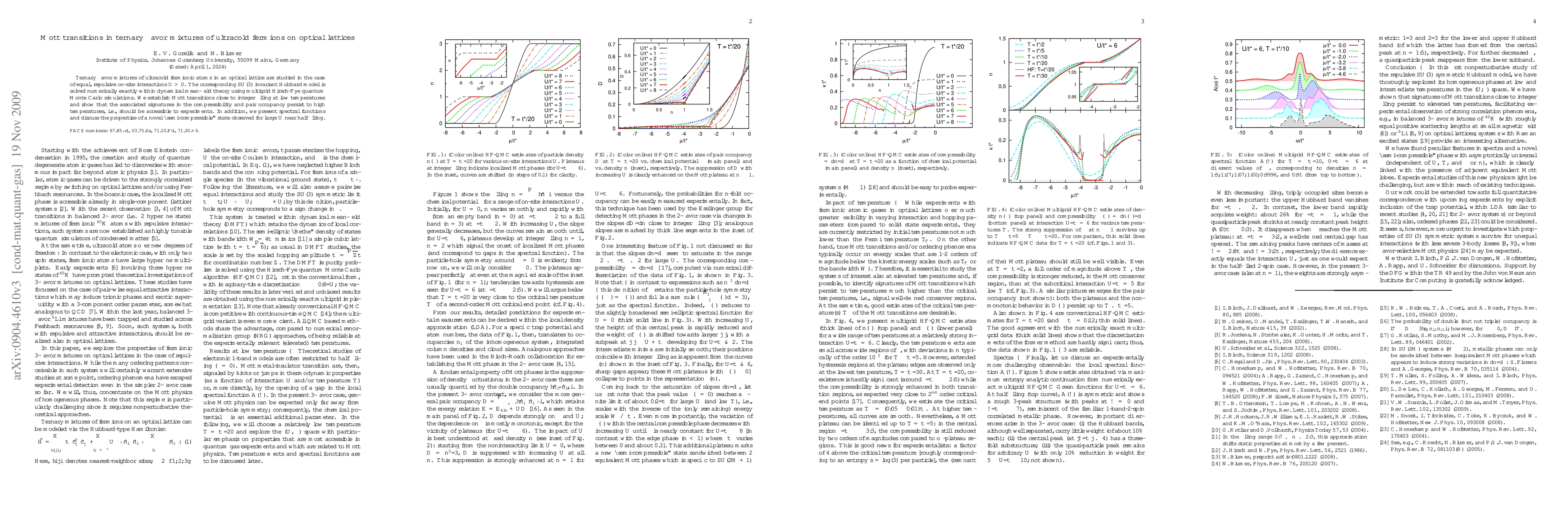 Ternary flavor mixtures of ultracold fermionic atoms in an optical lattice are studied in the case of equal, repulsive on-site interactions U>0. The corresponding SU(3) invariant Hubbard model is solved numerically exactly within dynamical mean-field theory using multigrid Hirsch-Fye quantum Monte Carlo simulations. We establish Mott transitions close to integer filling at low temperatures and show that the associated signatures in the compressibility and pair occupancy persist to high temperatures, i.e., should be accessible to experiments. In addition, we present spectral functions and discuss the properties of a ``semi-compressible'' state observed for large U near half filling.