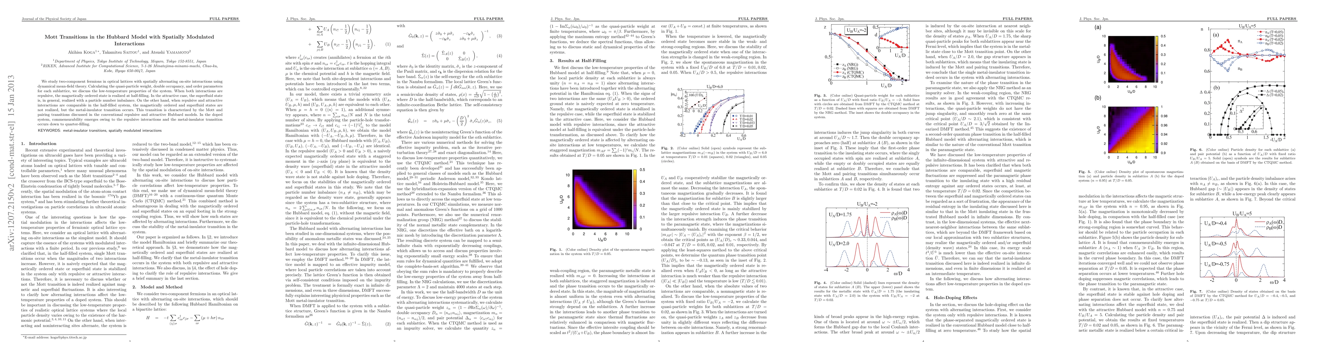 This paper investigates two-component fermions in optical lattices with spatially modulated interactions using dynamical mean-field theory, revealing that Mott transitions occur when both repulsive and attractive interactions are comparable, leading to a metal-insulator transition. The study shows that magnetically ordered and superfluid states emerge under specific interaction conditions, while commensurability and metal-insulator transitions appear in doped systems.