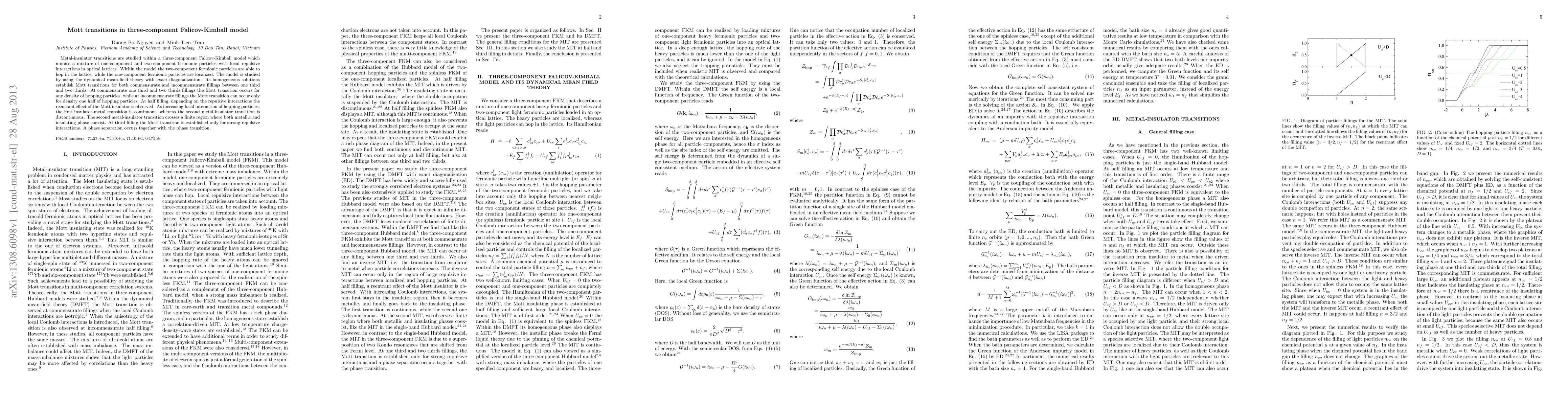 Metal-insulator transitions are studied within a three-component Falicov-Kimball model which mimics a mixture of one-component and two-component fermionic particles with local repulsive interactions in optical lattices. Within the model the two-component fermionic particles are able to hop in the lattice, while the one-component fermionic particles are localized. The model is studied by using the dynamical mean-field theory with exact diagonalization. Its homogeneous solutions establish Mott transitions for both commensurate and incommensurate fillings between one third and two thirds. At commensurate one third and two thirds fillings the Mott transition occurs for any density of hopping particles, while at incommensurate fillings the Mott transition can occur only for density one half of hopping particles. At half filling, depending on the repulsive interactions the reentrant effect of the Mott insulator is observed. As increasing local interaction of hopping particles, the first insulator-metal transition is continuous, whereas the second metal-insulator transition is discontinuous. The second metal-insulator transition crosses a finite region where both metallic and insulating phase coexist. At third filling the Mott transition is established only for strong repulsive interactions. A phase separation occurs together with the phase transition.