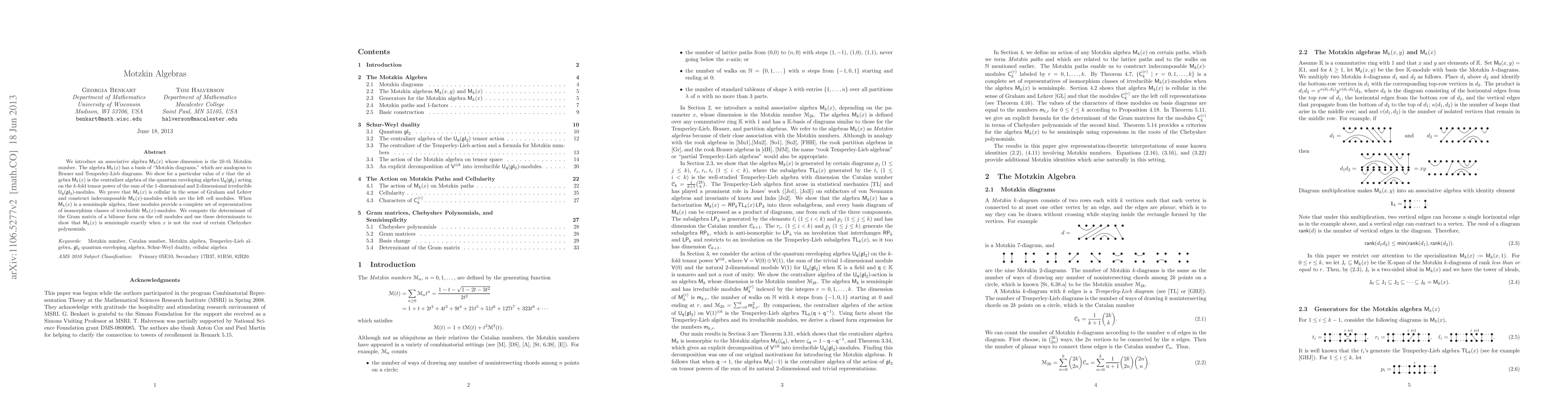 We introduce an associative algebra $\M_k(x)$ whose dimension is the $2k$-th Motzkin number. The algebra $\M_k(x)$ has a basis of "Motzkin diagrams," which are analogous to Brauer and Temperley-Lieb diagrams, and it contains the Temperley-Lieb algebra $\TL_k(x)$ as a subalgebra. We prove that for a particular value of $x$, the algebra $\M_k(x)$ is the centralizer algebra of $\uqsl$ acting on the $k$-fold tensor power of the sum of the 1-dimensional and 2-dimensional irreducible $\uqsl$-modules. We show that $\M_k(x)$ is generated by special diagrams $\ell_i, t_i, r_i \ (1 \le i < k)$ and $p_j \ (1 \le j \le k)$, and that it has a factorization into three subalgebras $\M_k(x) = \RP_k \TL_k(x)\, \LP_k$, all of which have dimensions given by Catalan numbers. We define an action of $\M_k(x)$ on Motzkin paths of rank $r$, and in this way, construct a set of indecomposable modules $\C_k^{(r)}$, $0 \le r \le k$. We prove that $\M_k(x)$ is cellular in the sense of Graham and Lehrer and that the $\C_k^{(r)}$ are the left cell representations. We compute the determinant of the Gram matrix of a bilinear form on $\C_k^{(r)}$ for each $r$ and use these determinants to show that $\M_k(x)$ is semisimple exactly when $x$ is not the root of certain Chebyshev polynomials.