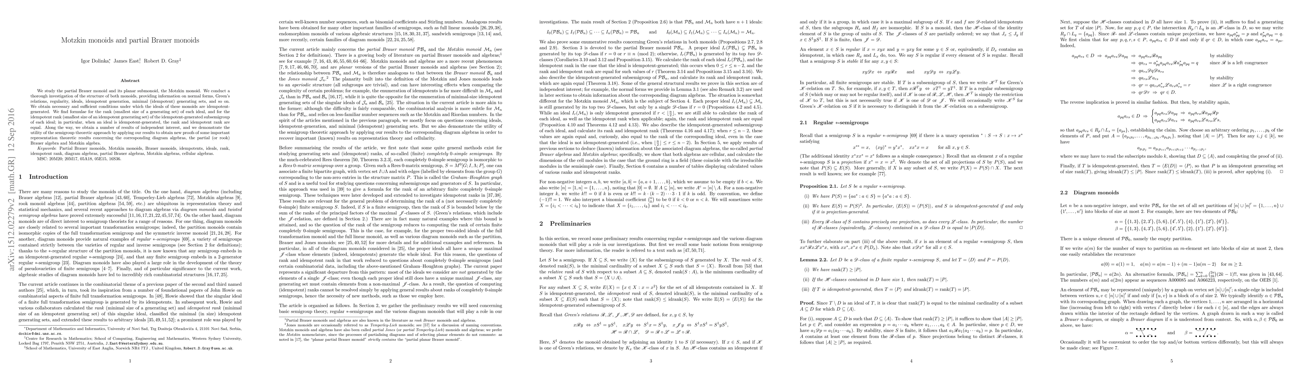 This paper explores the structure of the partial Brauer monoid and its submonoid, the Motzkin monoid, detailing their normal forms, Green's relations, and generating sets. It provides conditions for the idempotent-generation of ideals and derives formulas for their ranks, demonstrating applications to representation theory of diagram algebras.