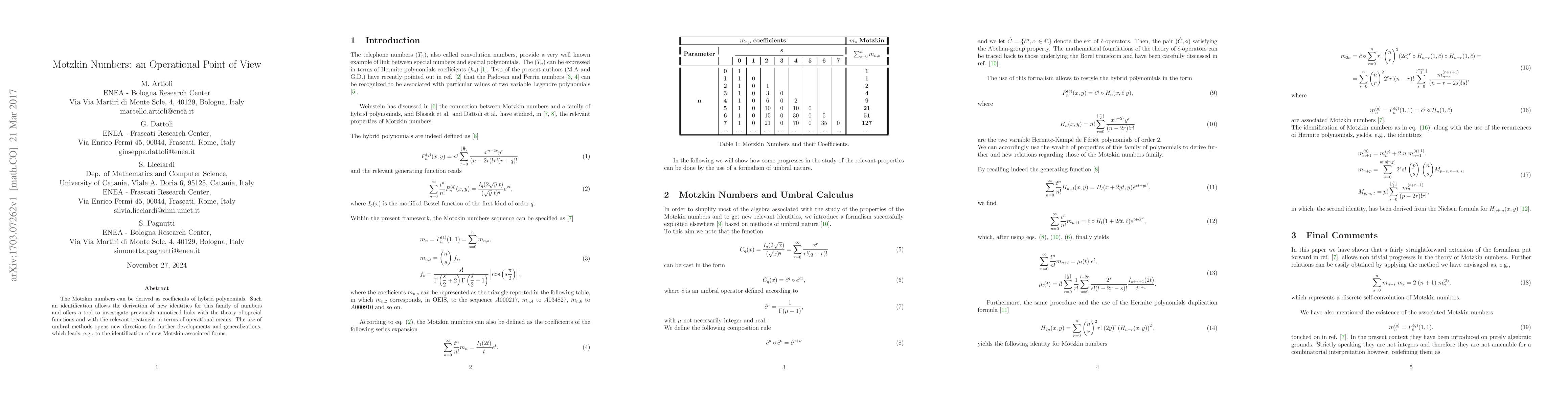 The Motzkin numbers can be derived as coefficients of hybrid polynomials. Such an identification allows the derivation of new identities for this family of numbers and offers a tool to investigate previously unnoticed links with the theory of special functions and with the relevant treatment in terms of operational means. The use of umbral methods opens new directions for further developments and generalizations, which leads, e.g., to the identification of new Motzkin associated forms.