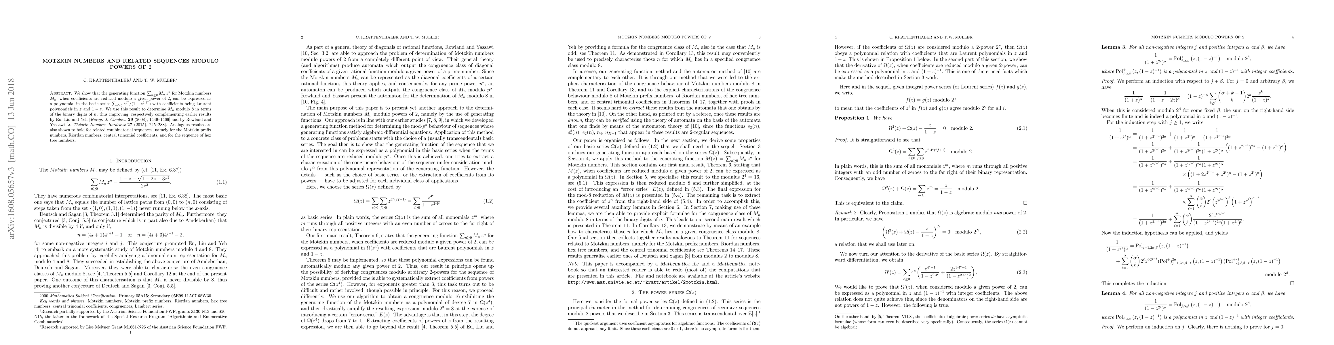 We show that the generating function $\sum_{n\ge0}M_n\,z^n$ for Motzkin numbers $M_n$, when coefficients are reduced modulo a given power of $2$, can be expressed as a polynomial in the basic series $\sum _{e\ge0} ^{} {z^{4^e}}/( {1-z^{2\cdot 4^e}})$ with coefficients being Laurent polynomials in $z$ and $1-z$. We use this result to determine $M_n$ modulo $8$ in terms of the binary digits of~$n$, thus improving, respectively complementing earlier results by Eu, Liu and Yeh [Europ. J. Combin. 29 (2008), 1449-1466] and by Rowland and Yassawi [J. Th\'eorie Nombres Bordeaux 27 (2015), 245-288]. Analogous results are also shown to hold for related combinatorial sequences, namely for the Motzkin prefix numbers, Riordan numbers, central trinomial coefficients, and for the sequence of hex tree numbers.