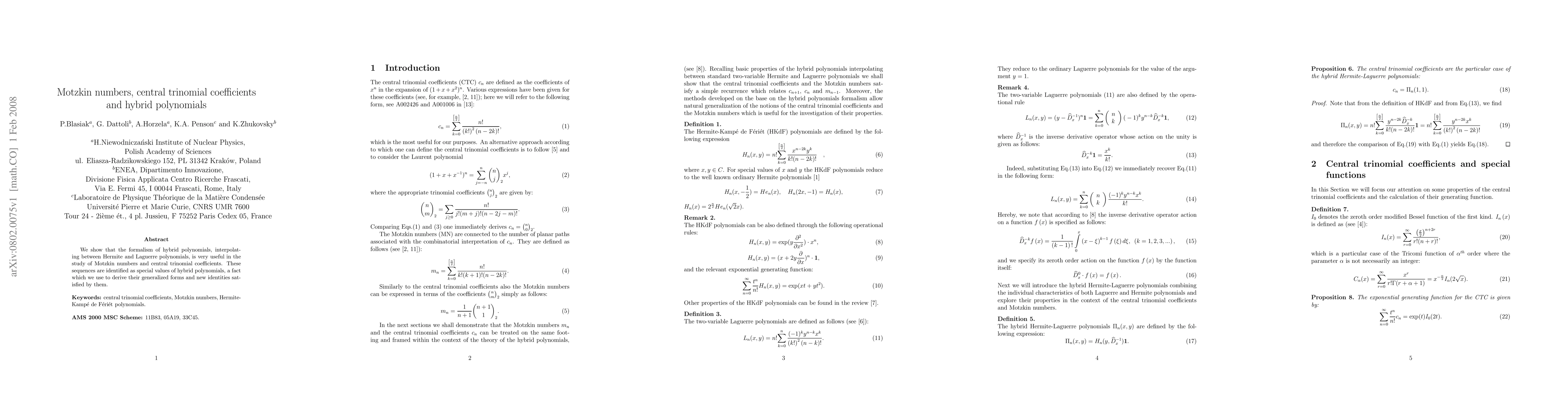 This paper demonstrates that hybrid polynomials, which interpolate between Hermite and Laguerre polynomials, provide a useful framework for studying Motzkin numbers and central trinomial coefficients. It reveals these sequences as special values of hybrid polynomials, leading to new generalized forms and identities.