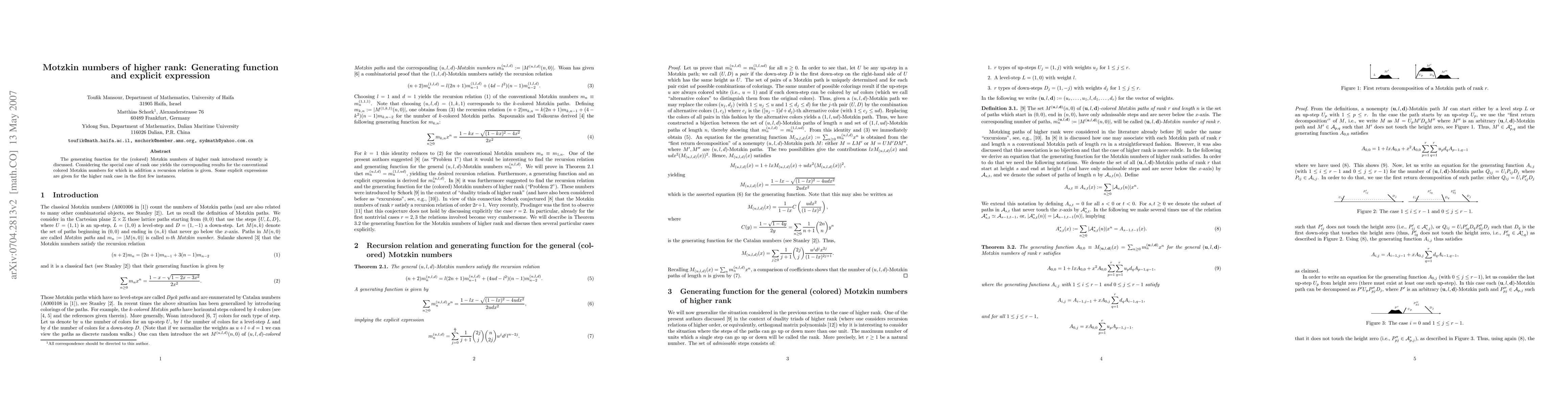 Summary: This paper derives the generating function and explicit expression for higher rank colored Motzkin numbers, and includes a recursion relation for the conventional colored Motzkin numbers when considering the rank one case.
