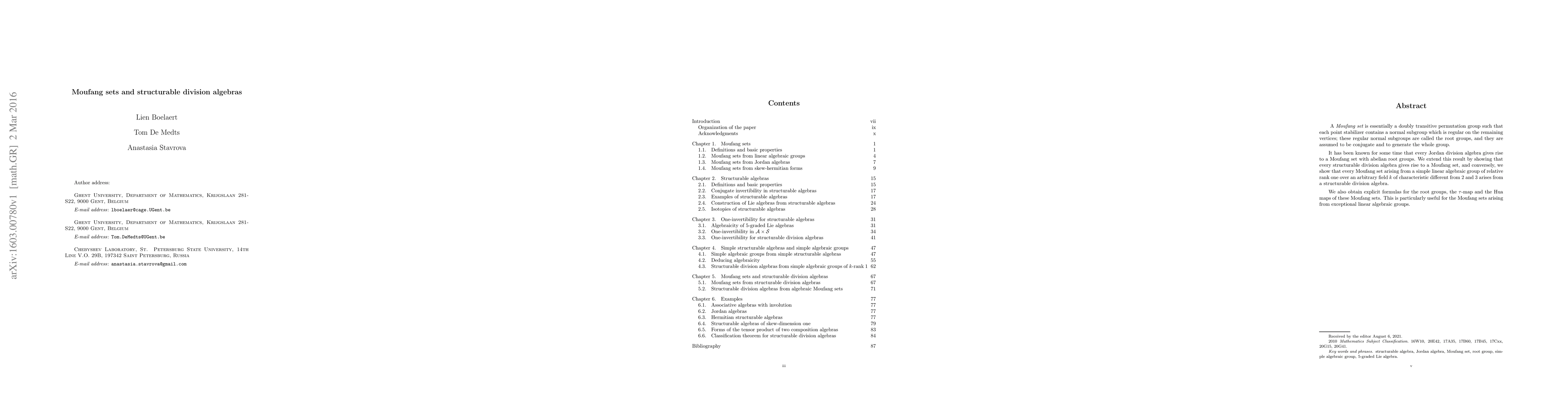 This paper establishes a connection between Moufang sets and structurable division algebras, demonstrating that every structurable division algebra generates a Moufang set, and vice versa for certain simple linear algebraic groups. It also provides explicit formulas for the root groups and associated maps in these Moufang sets.