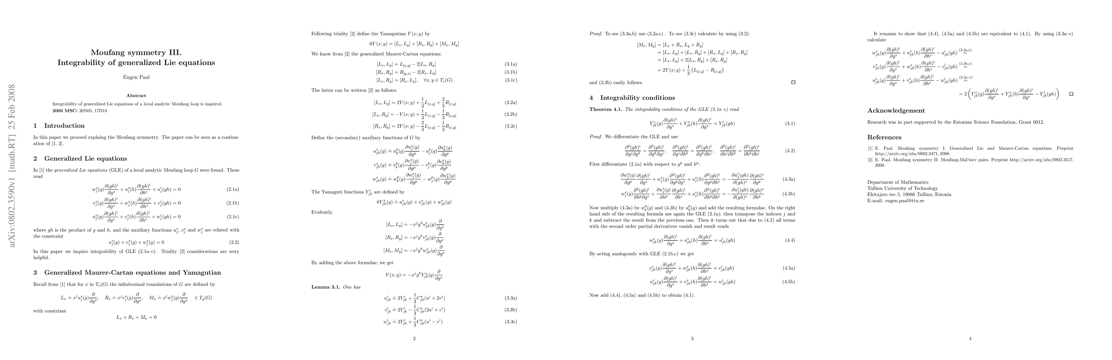 Summary: This paper investigates the integrability of generalized Lie equations associated with local analytic Moufang loops, exploring the underlying symmetry properties and their implications for the solvability of these equations.