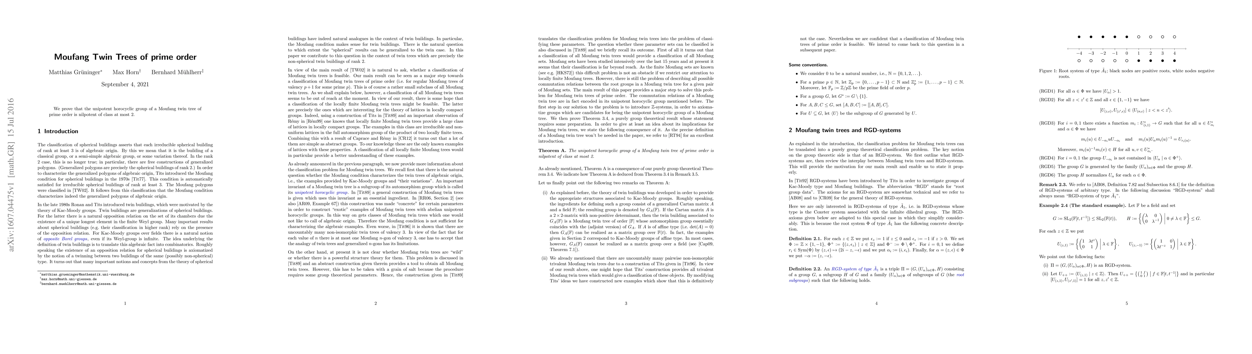 We prove that the unipotent horocyclic group of a Moufang twin tree of prime order is nilpotent of class at most 2.
